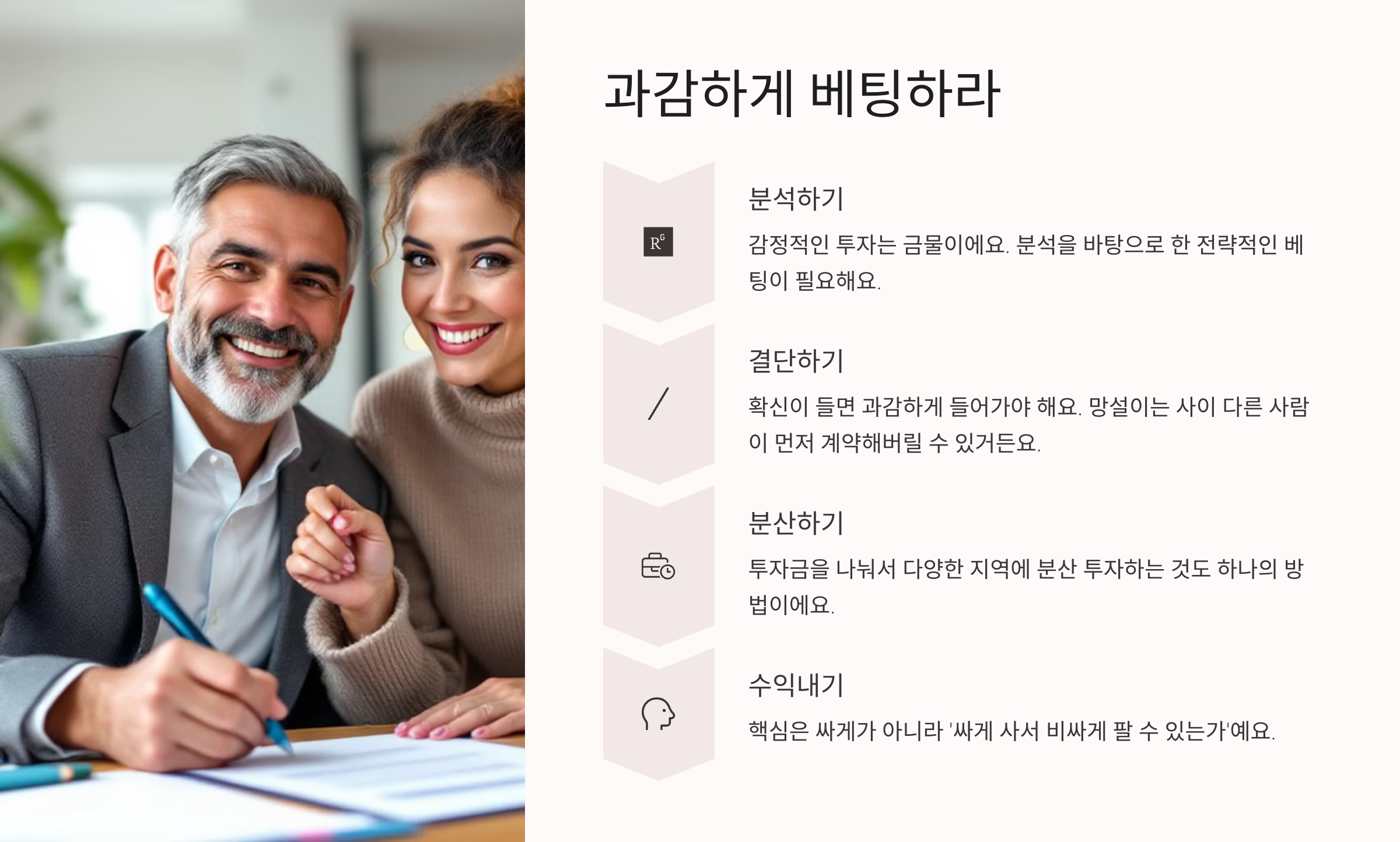 위험을 줄이면서 수익률을 극대화하려면, 투자금을 나눠서 다양한 지역에 분산 투자하는 것도 하나의 방법이에요. 땅 하나에 몰빵하기보다는 포트폴리오를 잘 구성하는 게 현명하죠. 과감함과 분산 전략, 이 두 가지가 균형을 이루면 베스트예요. 🧠