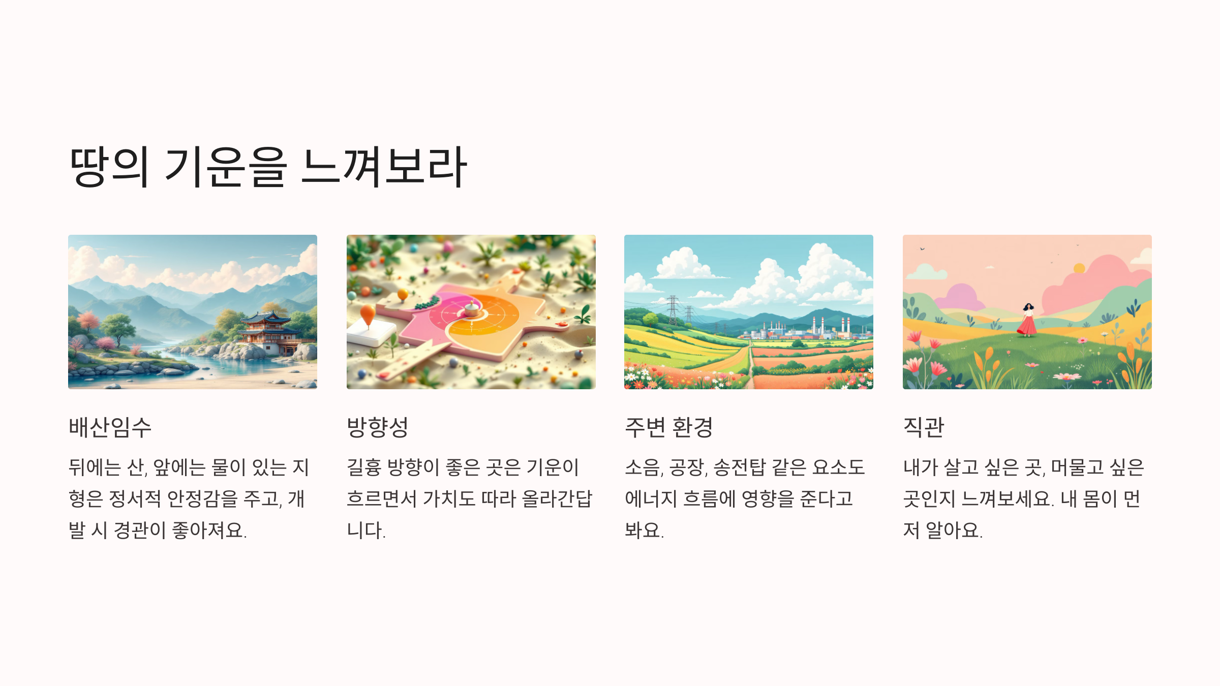 내가 살고 싶은 곳, 내가 머물고 싶은 곳인지 한 번 느껴보세요. 내 몸이 먼저 알아요. 땅의 기운을 무시하면 땅이 그 마음을 돌려주지 않거든요. 직관도 투자예요. 🌿