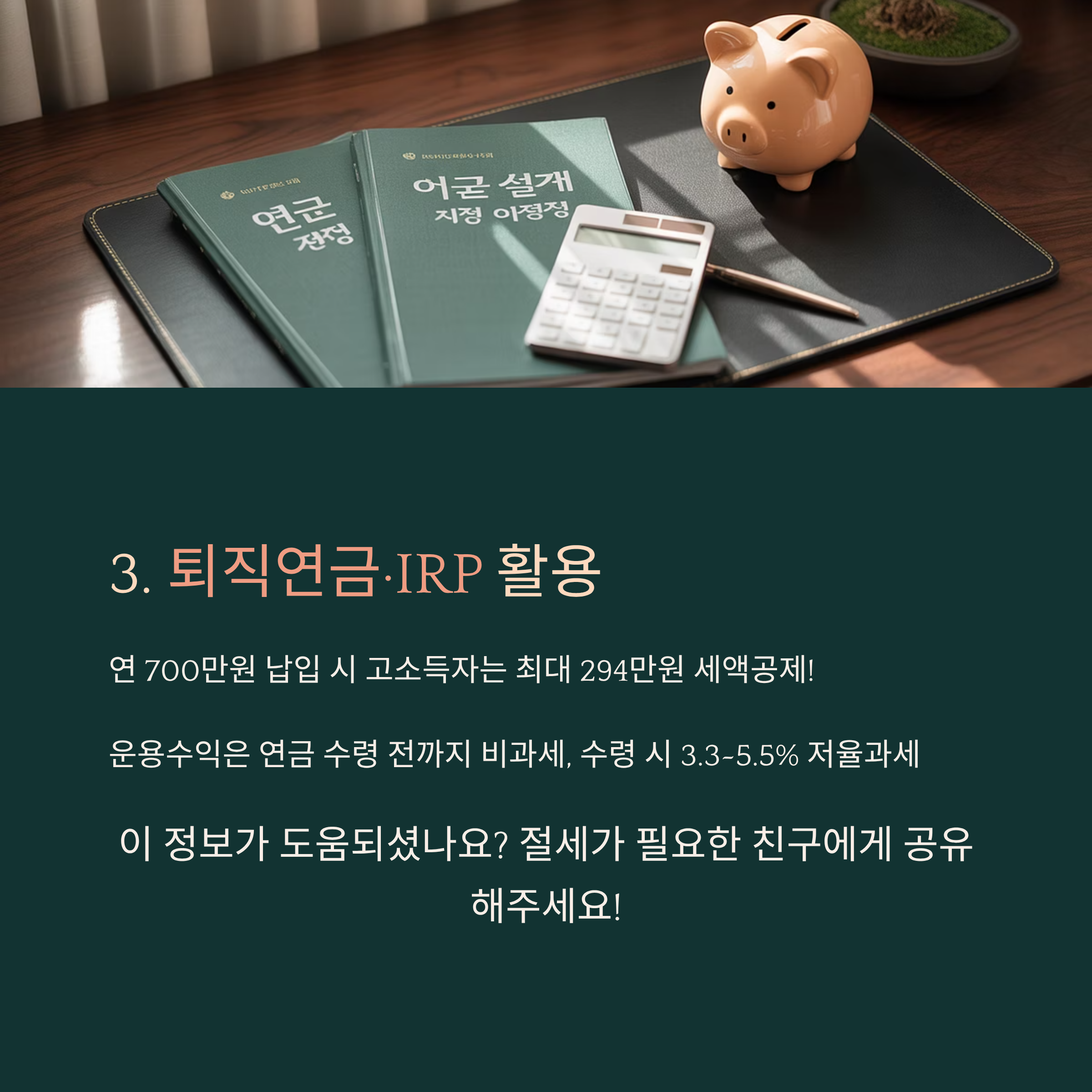 📌 본 글은 일반적인 세무 정보 제공을 위한 것이며, 실제 절세 적용 여부와 방법은 개인의 소득 구조와 세법 변경에 따라 달라질 수 있으니 세무 전문가와 상담 후 진행하세요.