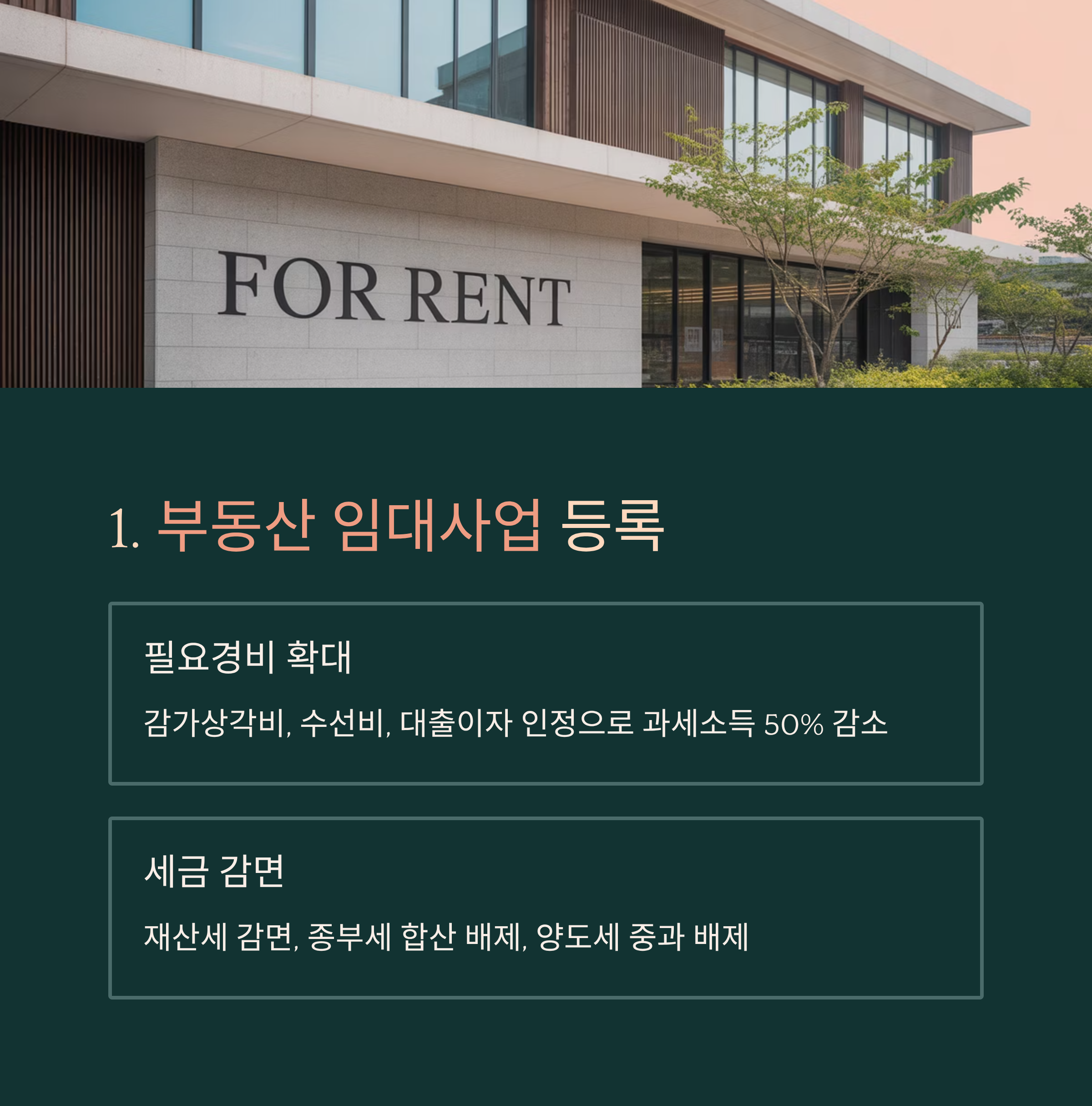 부동산 임대사업은 고소득자에게 가장 익숙하면서도 활용 폭이 넓은 절세 수단이에요. 특히 상가나 오피스텔, 다가구주택을 보유한 경우, 임대사업자 등록을 통해 종합소득세와 재산세, 종합부동산세 부담을 줄일 수 있죠. 임대사업자 등록을 하면 일정 기간 동안 재산세 감면, 종부세 합산 배제, 그리고 필요경비 인정 비율 확대 등의 혜택이 주어져요.