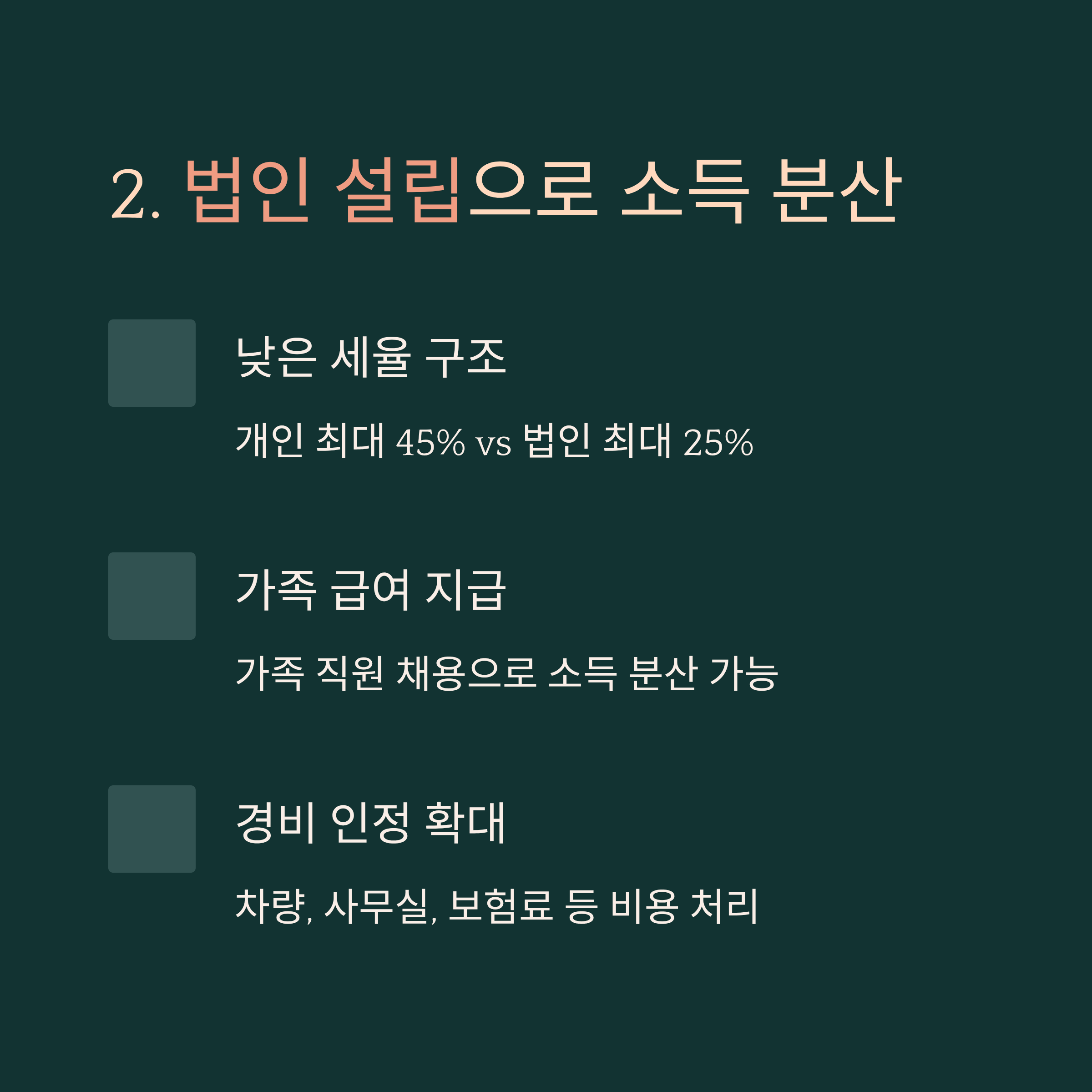 예를 들어, 연 소득이 5억 원인 프리랜서가 법인을 세워 일부 매출을 법인에 귀속시키고, 가족을 직원으로 채용해 인건비를 지급하면, 가족 구성원에게 소득을 분산해 전체 세율을 낮출 수 있어요.