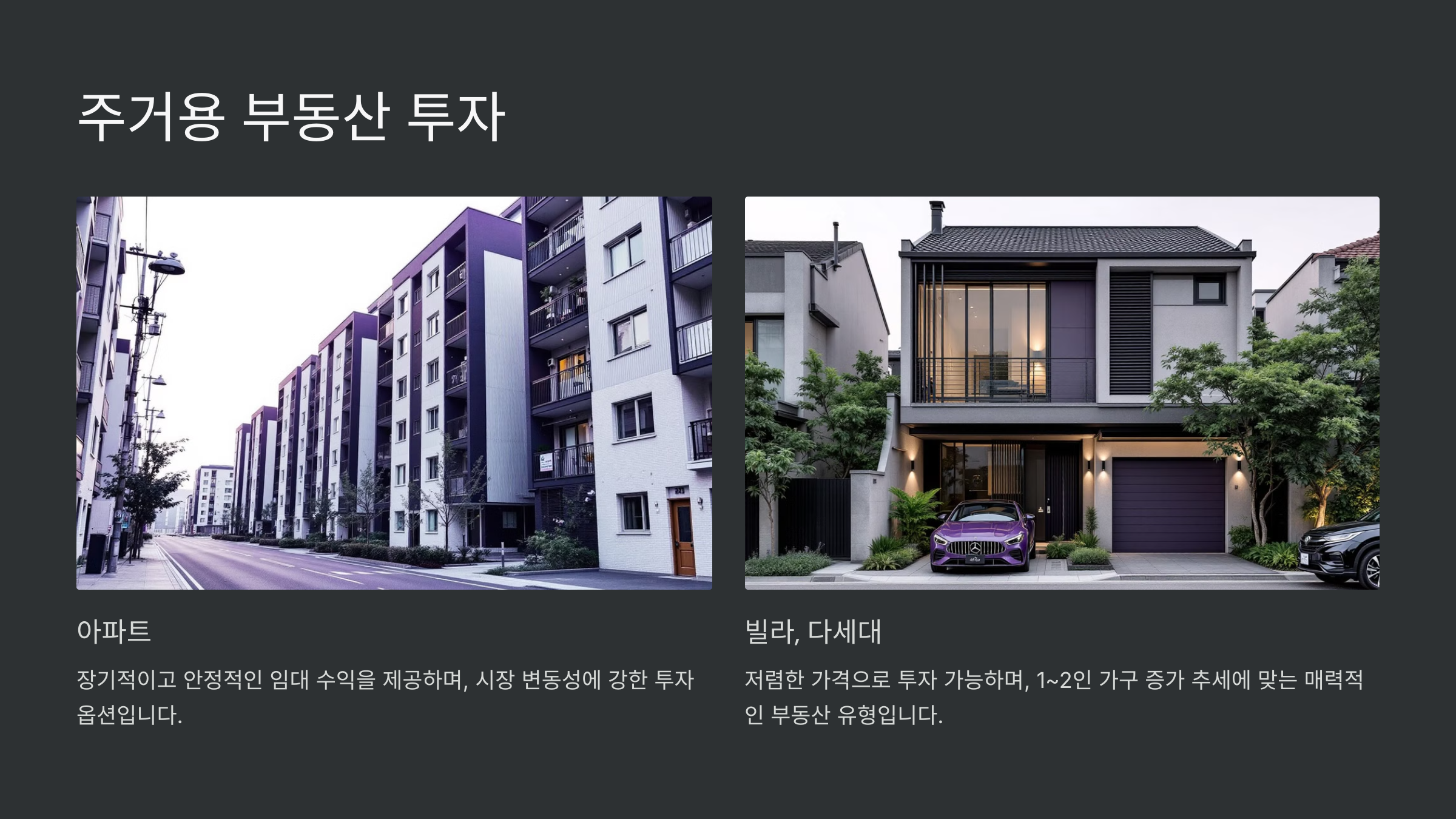✅ 주거용 부동산: 아파트, 빌라, 다세대주택 등을 포함하며 안정적인 임대 수익을 기대할 수 있어요.