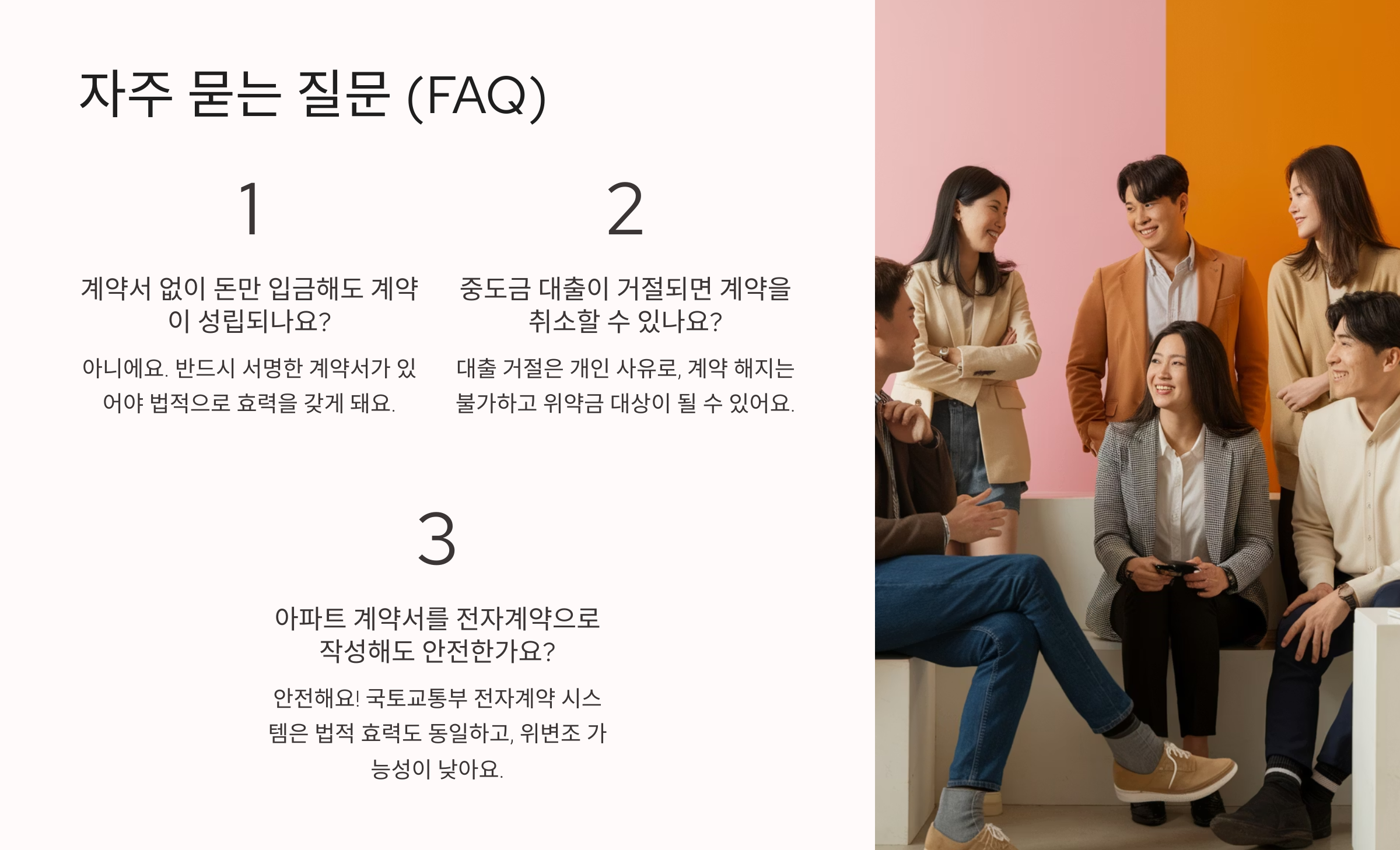 이제 아파트 계약의 모든 절차를 끝냈어요! 처음부터 계약서 작성, 돈 지급, 해제 요건, 등기까지 하나하나 확인하셨죠? 마지막으로, 많은 분들이 실제로 자주 궁금해하는 아파트 계약 관련 질문 8가지를 FAQ로 정리해드릴게요.