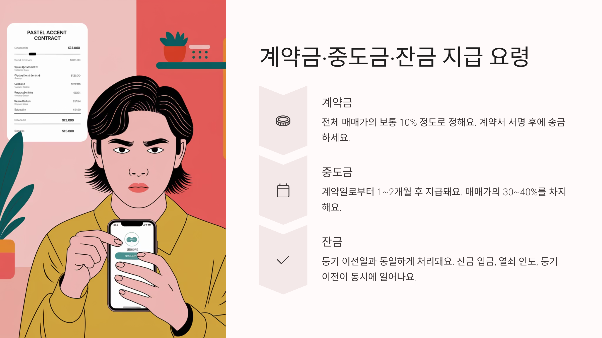 이제 실수 없이 계약서를 쓰기 위한 준비가 어느 정도 되었어요. 다음으로는 실제 돈이 오가는 순간인 ‘계약금·중도금·잔금 지급’에 대해 구체적으로 설명드릴게요. 돈이 들어가는 부분이니 특히 주의해야 해요!