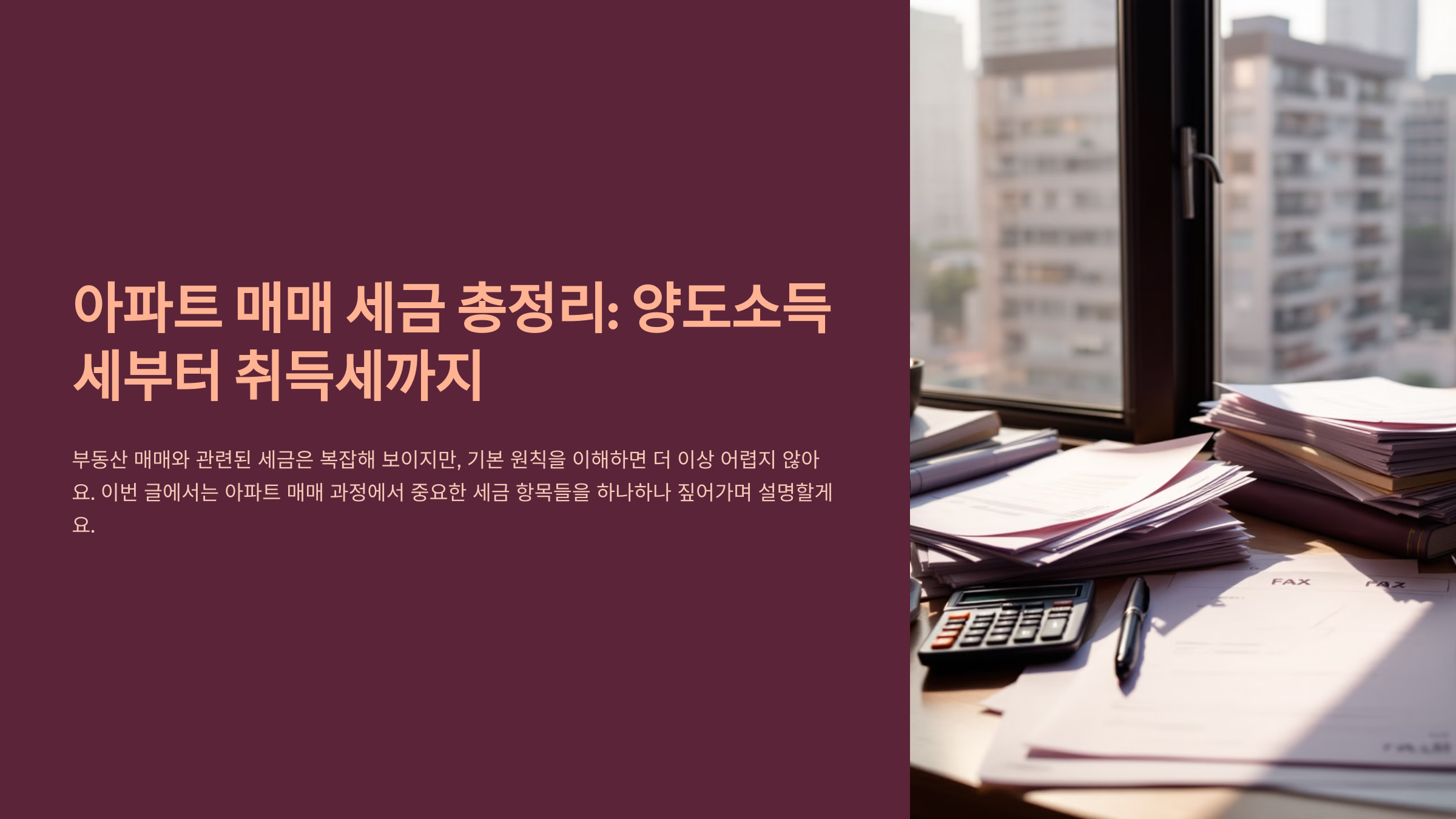 이번 글에서는 아파트 매매 과정에서 중요한 세금 항목들을 하나하나 짚어가며 설명할게요. 양도소득세와 취득세는 물론, 등록세, 재산세, 임대소득세까지 아우르며 실질적인 정보를 제공하려 해요.