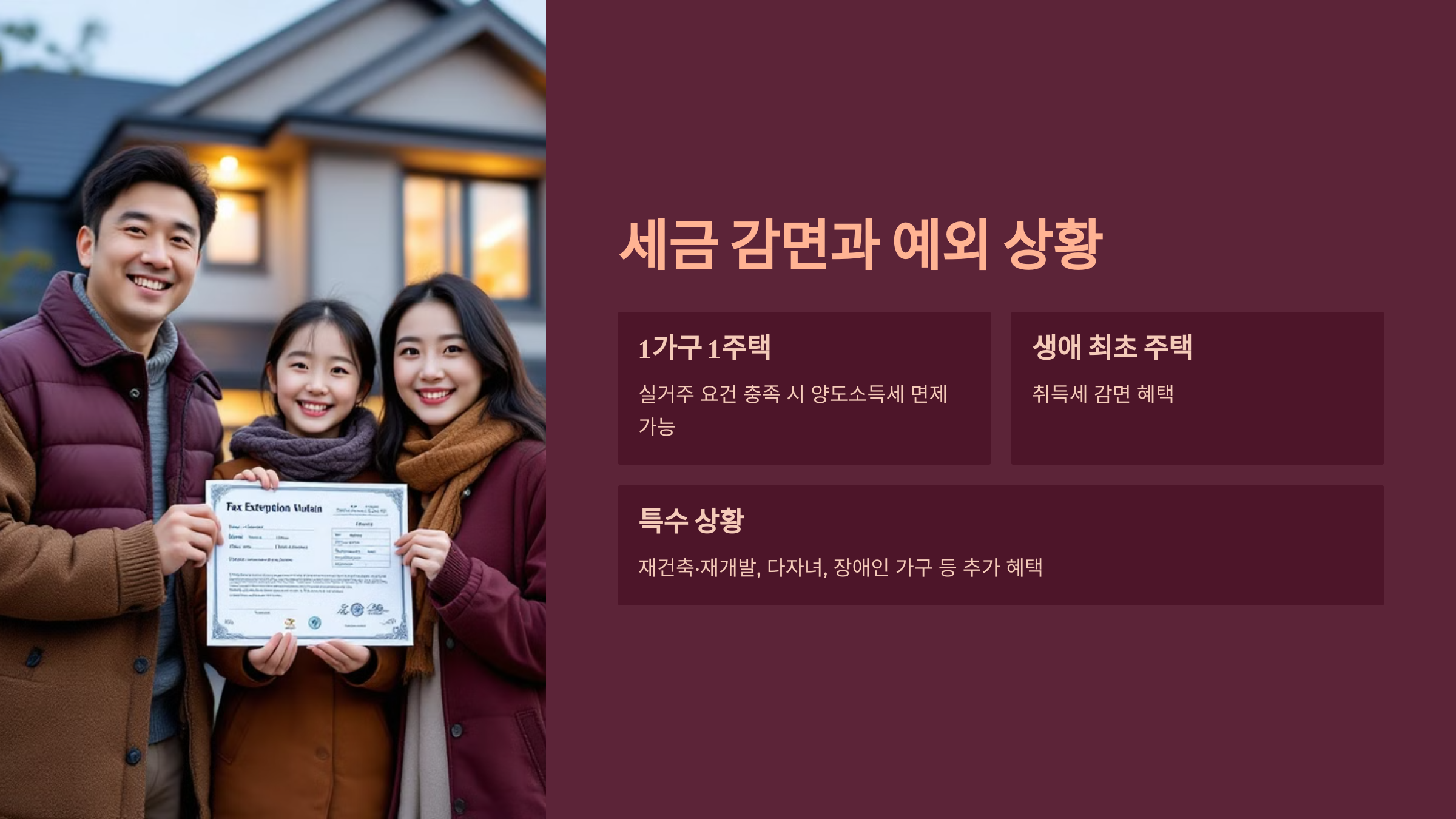 아파트 매매와 관련된 세금에는 감면 혜택이나 예외 상황도 많아요. 대표적으로 1가구 1주택 보유자는 실거주 요건을 충족하면 양도소득세를 완전히 면제받을 수 있어요. 다만, 실거주 기간을 충족하지 못하거나 고가 주택일 경우 일부 세금을 납부해야 할 수도 있어요.