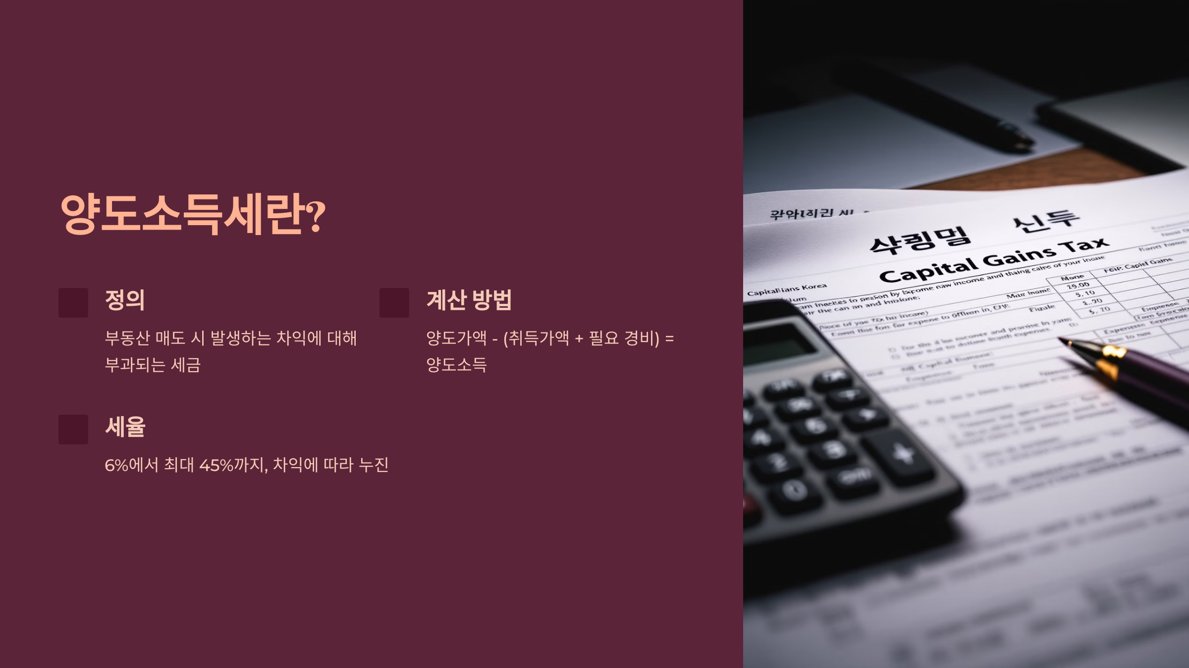 양도소득세는 아파트와 같은 부동산을 매도했을 때 발생하는 차익에 대해 부과되는 세금이에요. 이를테면 매입가보다 더 높은 금액으로 매도했을 경우, 발생한 소득에 대해 세금을 내야 하죠. 이 세금은 과세 표준에 따라 누진세율이 적용되며, 주택 보유 기간, 거주 여부, 1가구 1주택 여부 등에 따라 달라져요.