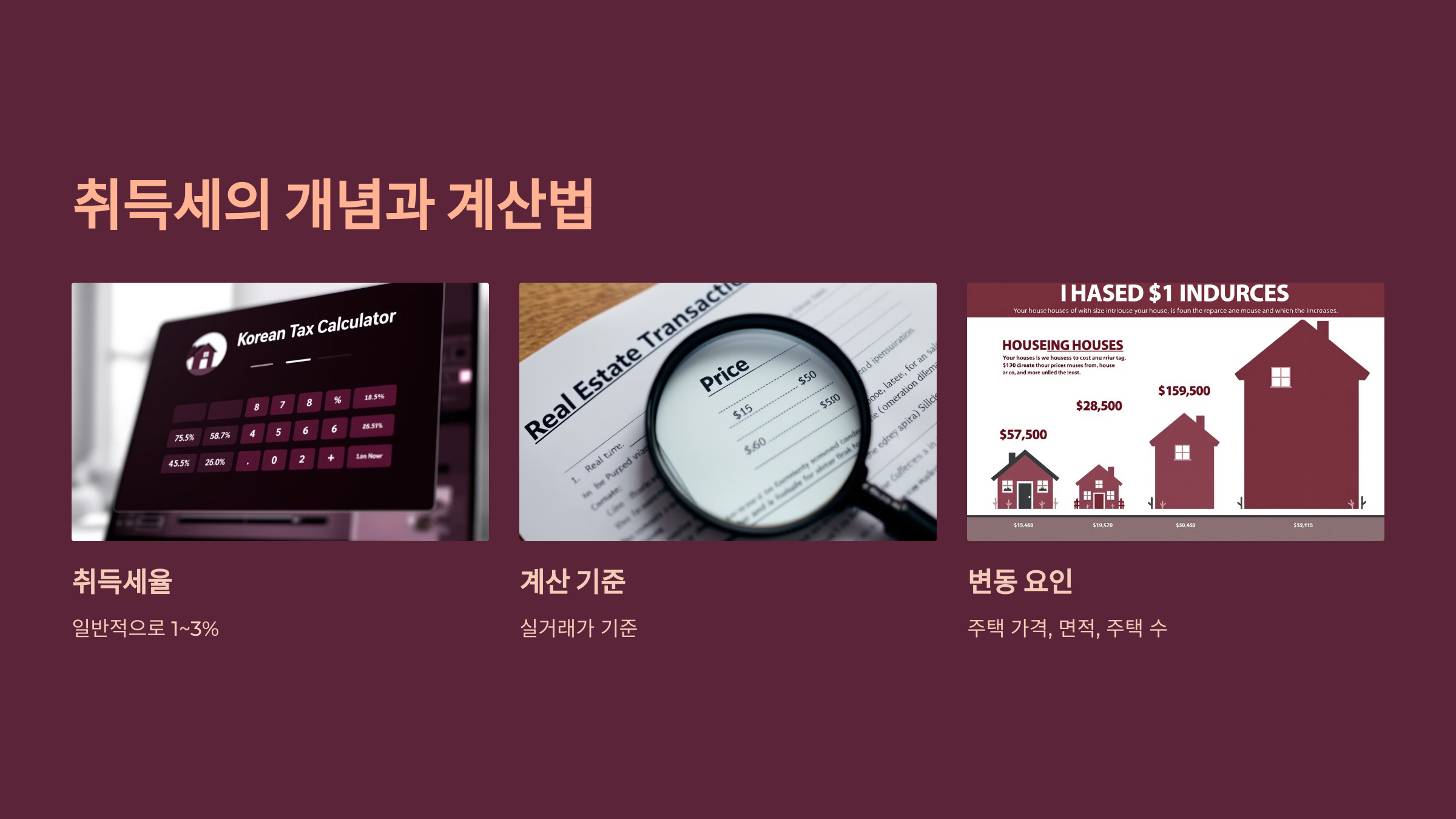 취득세는 말 그대로 부동산을 취득할 때 부과되는 지방세예요. 아파트 구매 시 실거래가를 기준으로 일정 비율의 세율을 곱해 계산돼요. 취득세율은 주택 가격, 면적, 그리고 주택 수에 따라 달라지며, 일반적으로 1~3% 정도로 책정돼요.