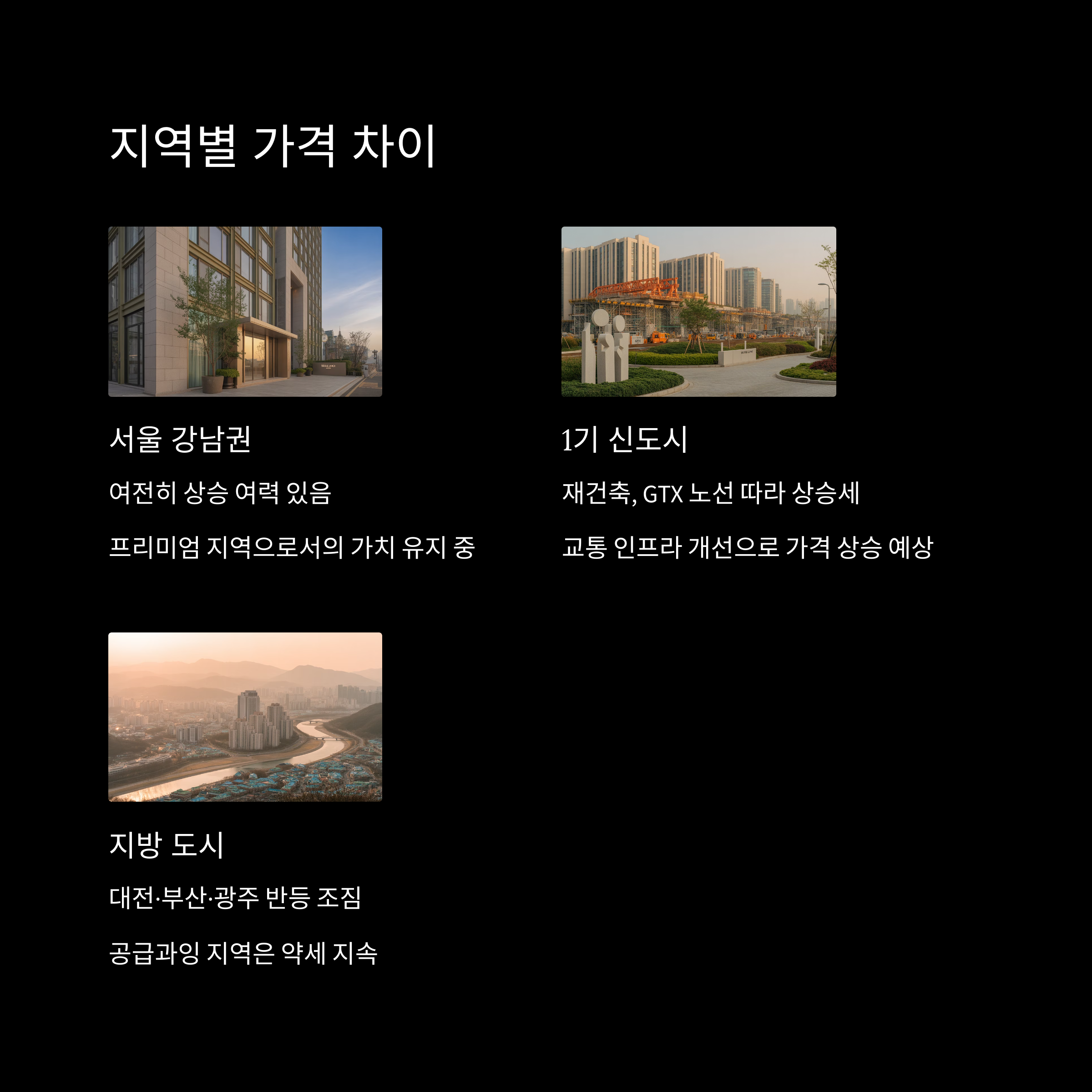 지방은 대전·부산·광주는 규제 완화 이후 약간의 반등 조짐이 보이지만, 공급 과잉 지역은 여전히 약세예요. 실수요자가 몰리는 핵심 입지 아니면 가격 반등은 쉽지 않아요.