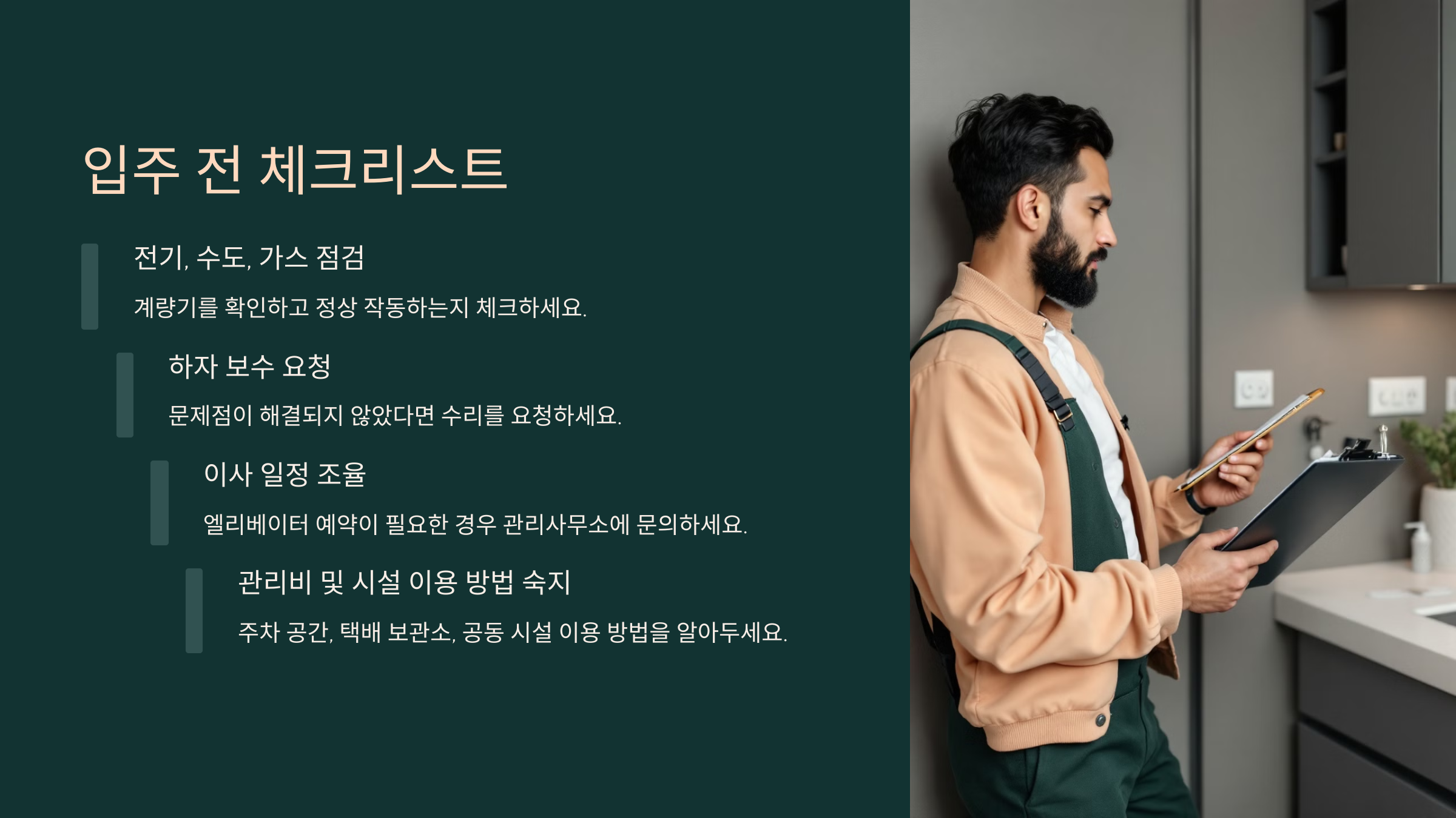 🏢 **관리비 및 시설 이용 방법 숙지**: 아파트 단지 내 주차 공간, 택배 보관소, 공동 시설 이용 방법을 미리 알아두세요.