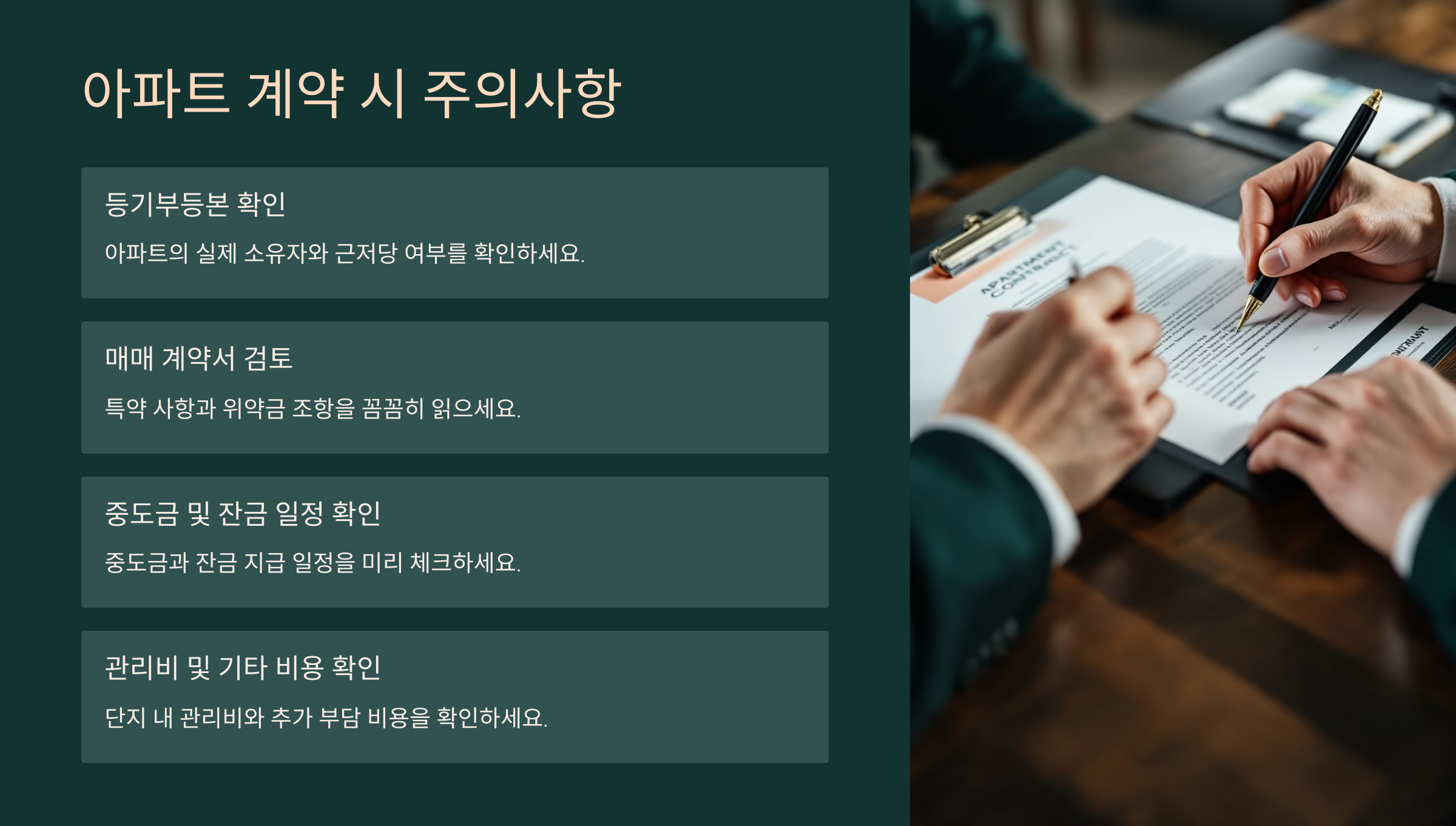 📄 **등기부등본 확인**: 아파트의 실제 소유자가 맞는지, 근저당(담보 대출)이 설정되어 있는지 꼭 확인해야 해요.