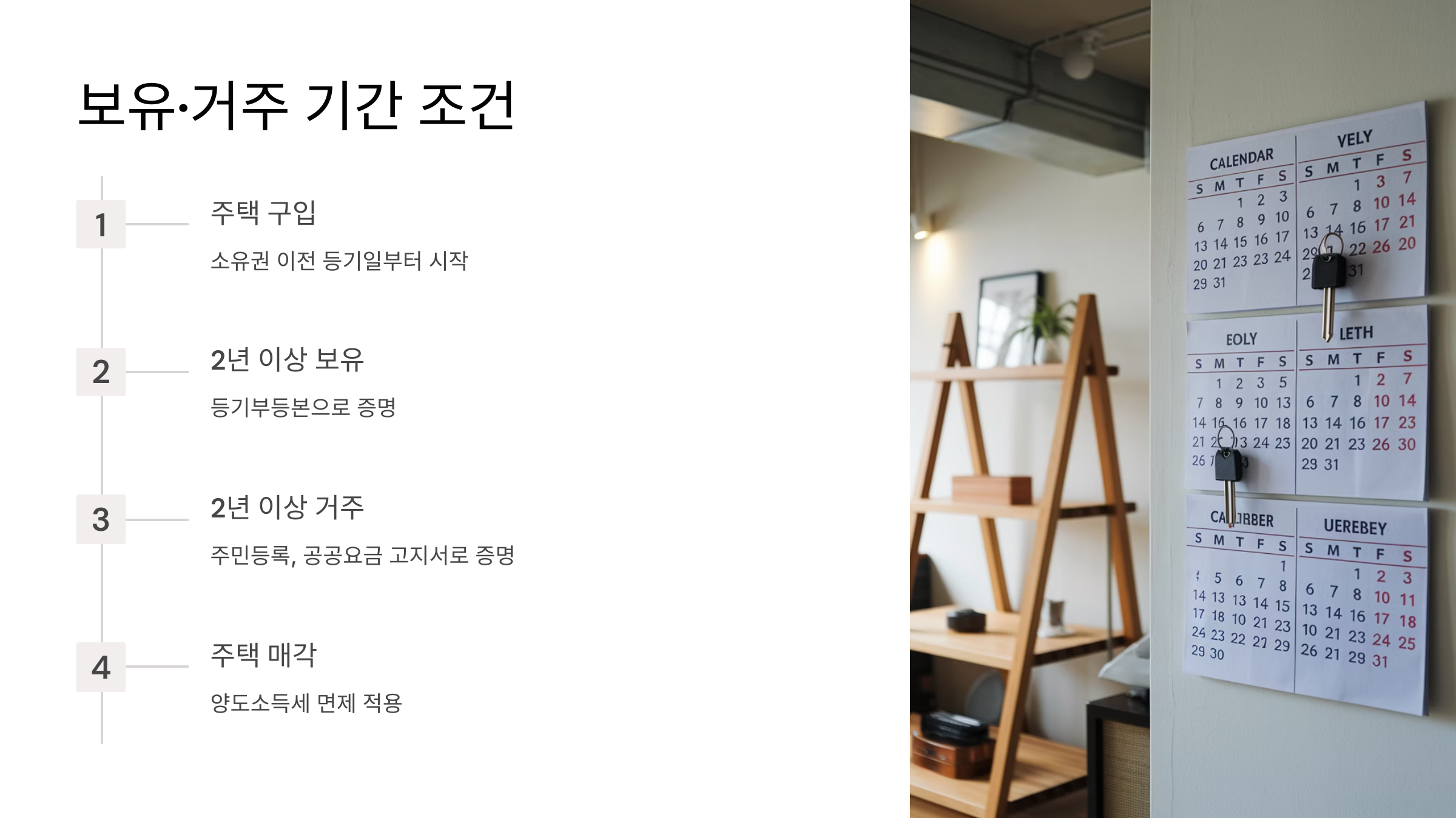 나의느낌으로는 보유·거주 기간 조건은 단순한 날짜 이상의 의미가 있어요. 실제 거주 사실을 증빙할 수 있는 자료 준비가 중요하다고 생각해요.