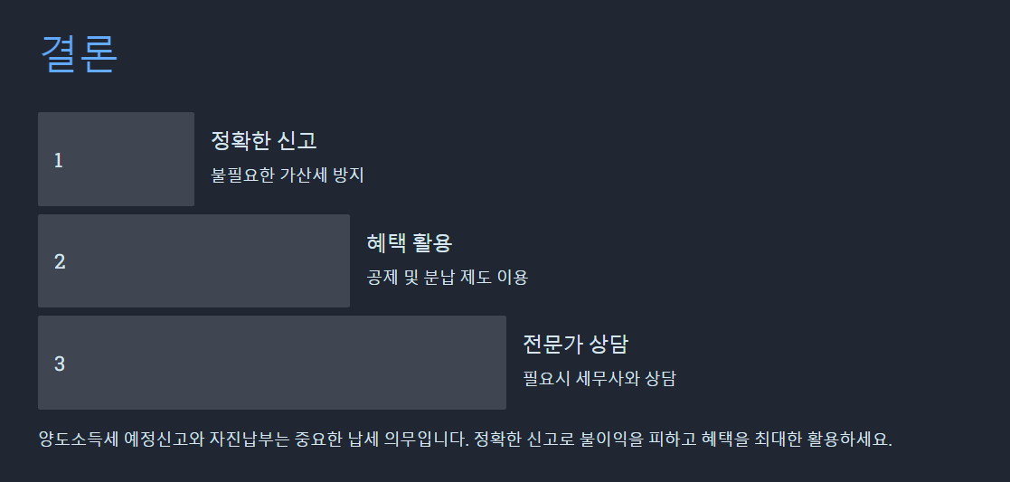 양도소득세 예정신고와 자진납부는 납세자가 반드시 숙지해야 할 중요한 절차입니다. 정확한 신고를 통해 불필요한 가산세를 방지하고, 혜택을 최대한 활용하는 것이 중요합니다. 만약 신고 과정이 복잡하거나 어려운 점이 있다면, 세무사와의 상담을 통해 안전하게 진행하는 것을 권장드립니다.