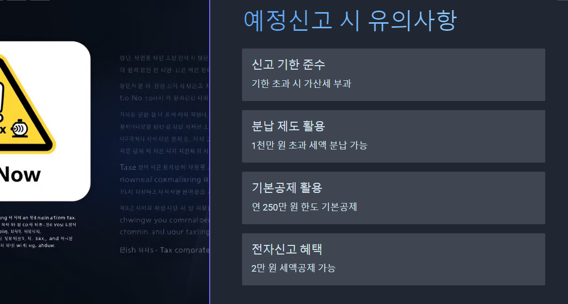 예정신고를 하지 않으면 미납 세액의 20%에 해당하는 가산세가 부과됩니다. 신고는 했지만 납부를 하지 않은 경우에도 동일한 비율로 가산세가 적용됩니다.