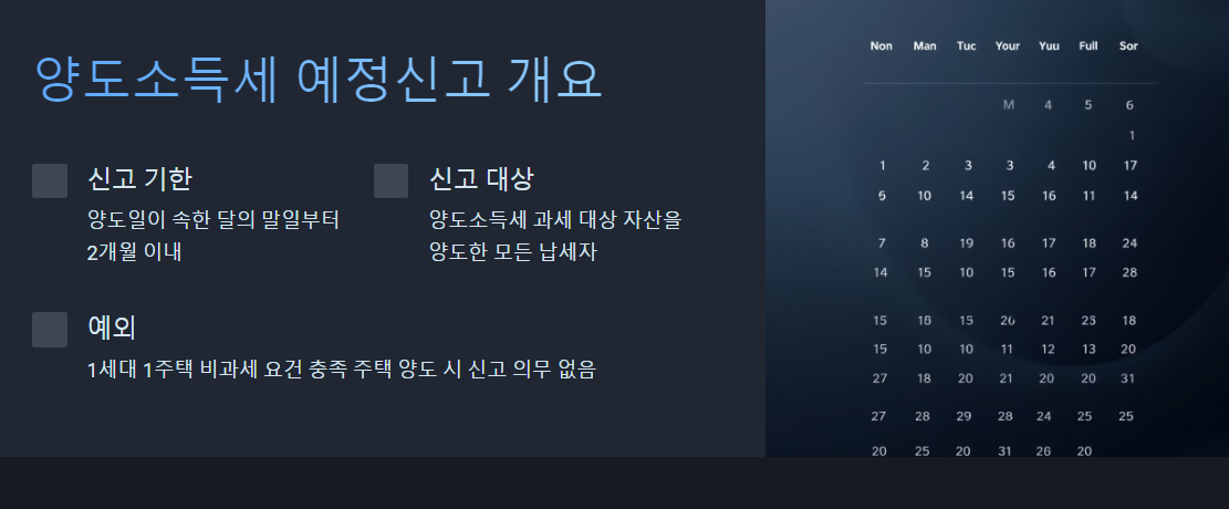 - 양도소득세 과세 대상 자산을 양도한 모든 납세자는 예정신고 대상입니다.