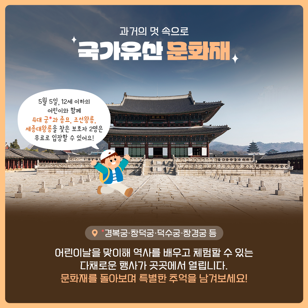 5월 5일에는 12세 미만의 자녀와 함께 경복궁, 창덕궁, 덕수궁, 창경궁 등 4대 궁에서 한국의 풍부한 역사를 무료로 탐험해 보세요. 종묘와 왕릉에 어린이를 동반한 보호자도 무료로 입장할 수 있습니다. 자녀에게 국가의 유산에 대해 흥미로운 방식으로 가르칠 수 있는 훌륭한 기회입니다.