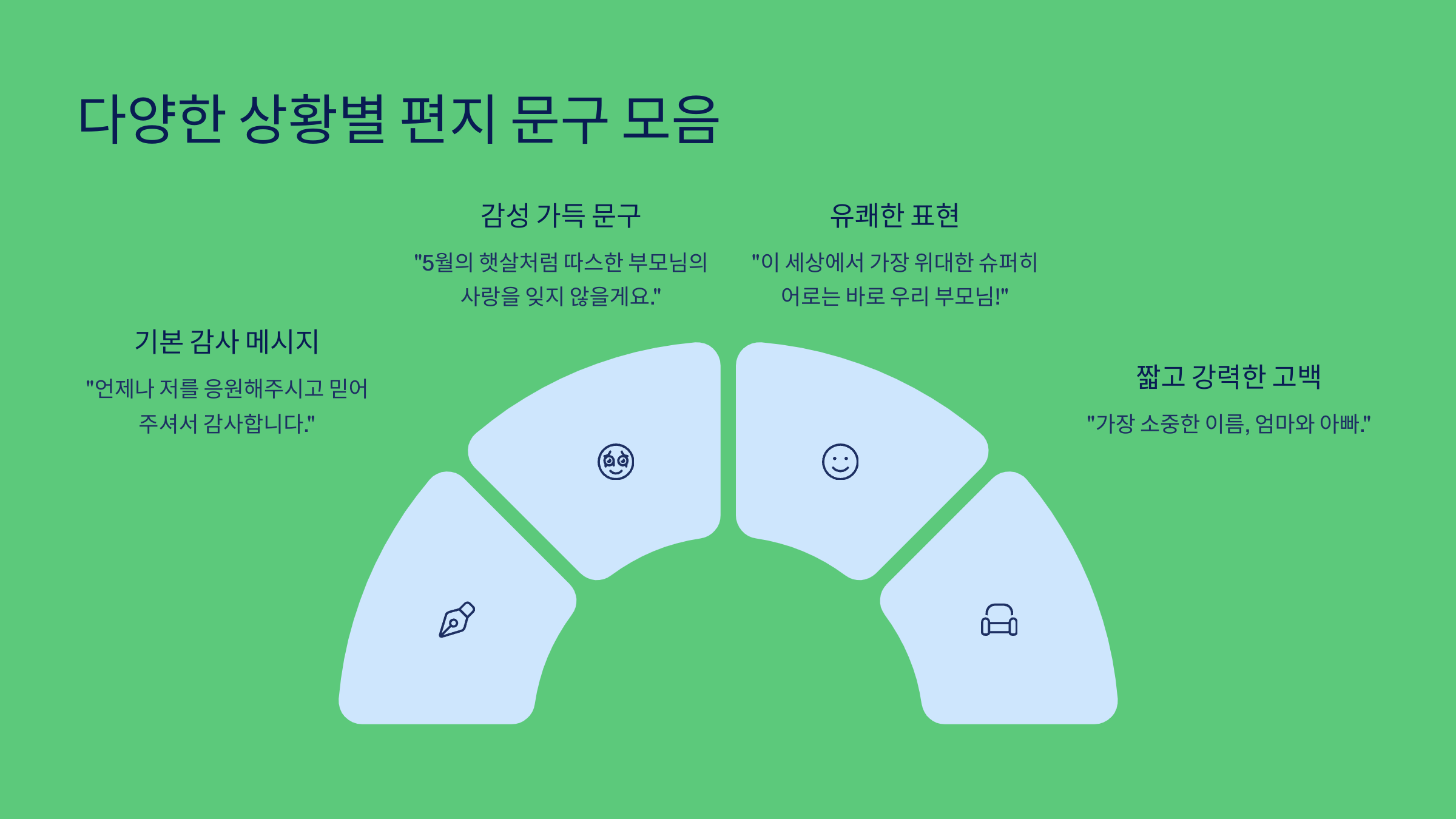 | 카드에 짧게 | 짧고 강렬한 고백 | "가장 소중한 이름, 엄마 아빠." |