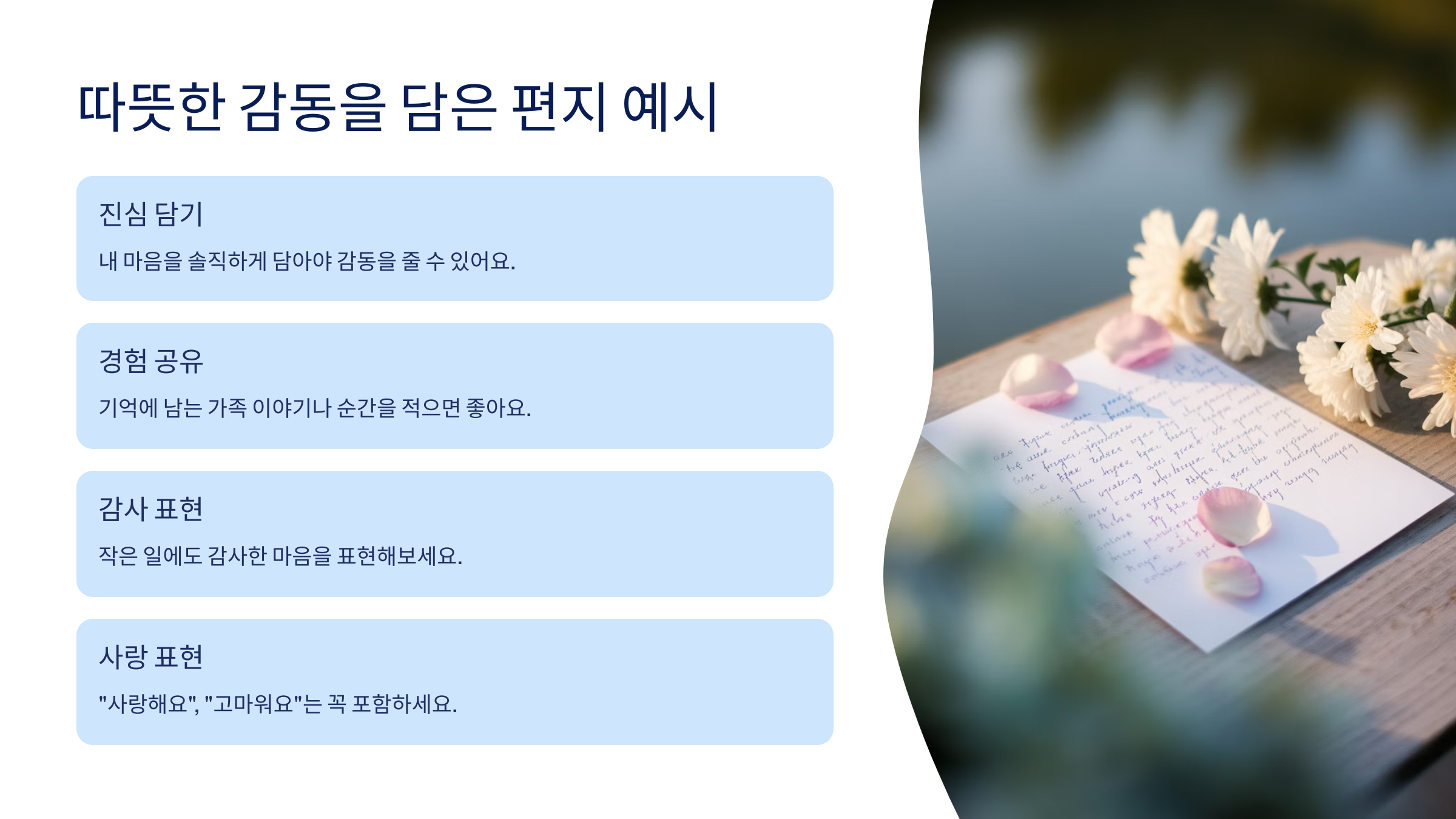 이 체크리스트대로만 쓰면, 누구든지 감동적인 손편지를 완성할 수 있어요. 부담 갖지 말고, 마음이 가는 대로 꾹꾹 눌러 써보세요. 부모님께는 글자 하나하나가 사랑으로 느껴질 거예요 🌸