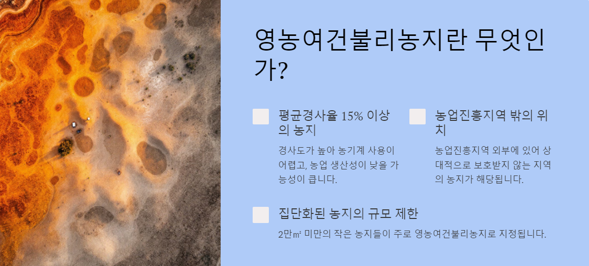 영농여건불리농지는 일반 농지와 달리 농지 취득 및 활용에 있어 간소화된 절차와 규정을 적용받습니다. 이는 농업의 다양성을 증대시키고, 불리한 조건에서도 농지를 효율적으로 활용할 수 있는 기회를 제공합니다.