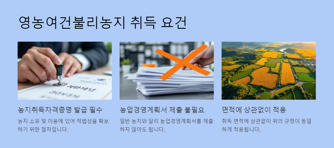 일반 농지와 달리 농업경영계획서를 제출하지 않아도 됩니다. 이는 영농여건불리농지가 가진 특수성을 고려한 규정입니다.