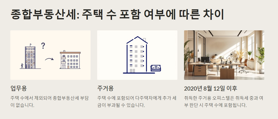 - 업무용: 주택 수에서 제외되므로 종합부동산세 부담이 없습니다.
