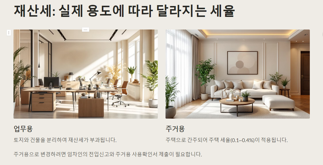 - 주거용: 주택으로 간주되어 주택 세율(0.1~0.4%)이 적용됩니다.