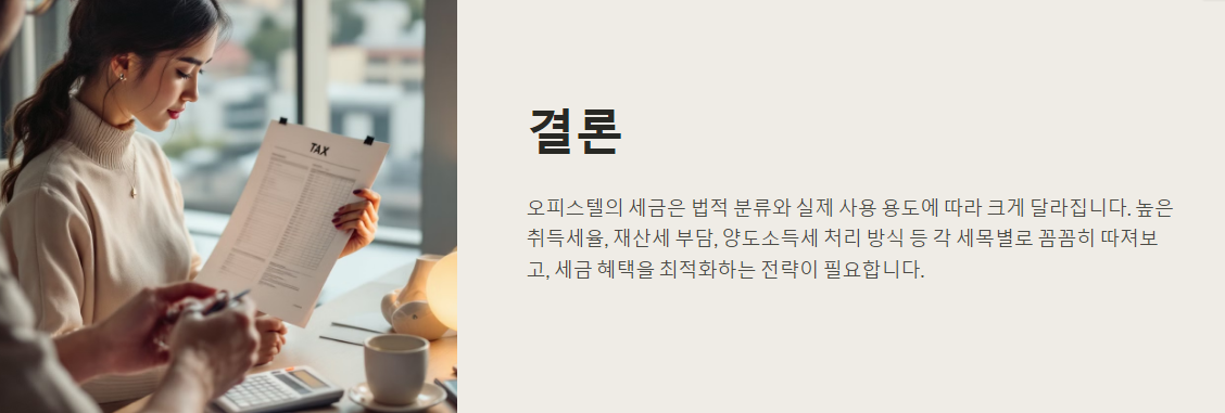 오피스텔의 세금은 법적 분류와 실제 사용 용도에 따라 크게 달라집니다. 높은 취득세율, 재산세 부담, 양도소득세 처리 방식 등 각 세목별로 꼼꼼히 따져보고, 세금 혜택을 최적화하는 전략이 필요합니다.