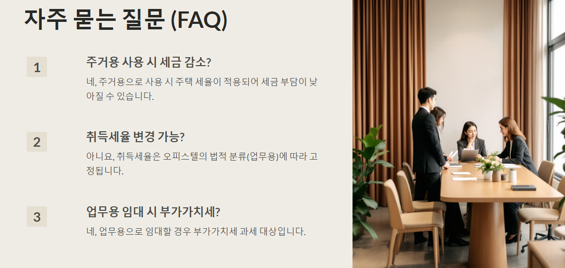 - 용도 변경 신중 결정: 업무용에서 주거용으로 변경 시 세금 규정이 달라질 수 있으므로 사전에 충분한 검토가 필요합니다.