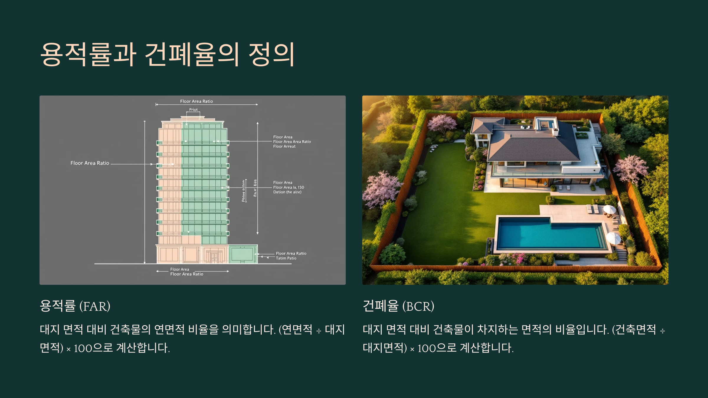 | 건폐율 (BCR) | (건축면적 ÷ 대지면적) × 100 | 건물이 대지에서 차지하는 바닥 면적 비율 |