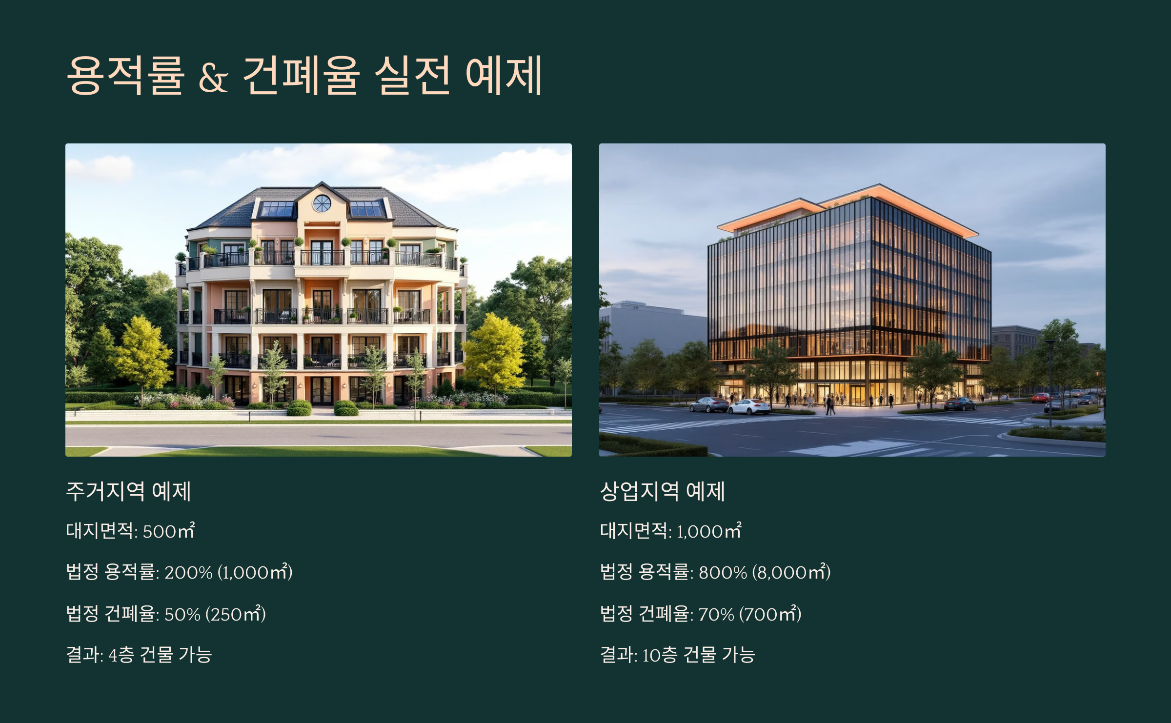 용적률과 건폐율은 토지 위에 얼마나 많은 건물을 지을 수 있는지를 결정하는 중요한 기준이에요. 두 개념 모두 건축법과 도시계획에서 필수적으로 고려해야 하는 요소죠. 📜