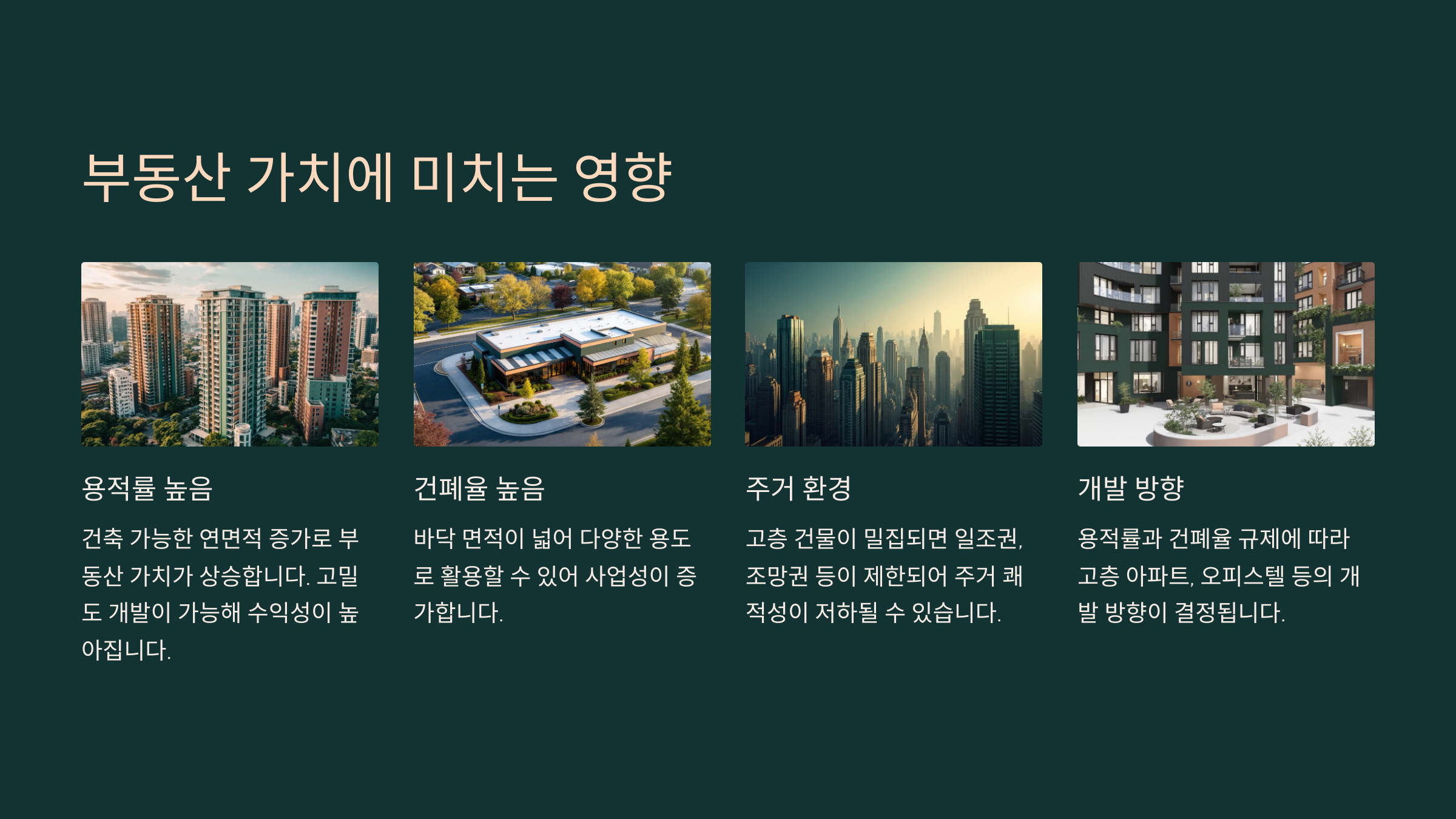 용적률과 건폐율은 부동산의 가치에 직접적인 영향을 줘요. 같은 면적의 토지라도 용적률이 높으면 더 많은 건물을 지을 수 있어, 투자 가치가 상승할 수 있어요. 📈