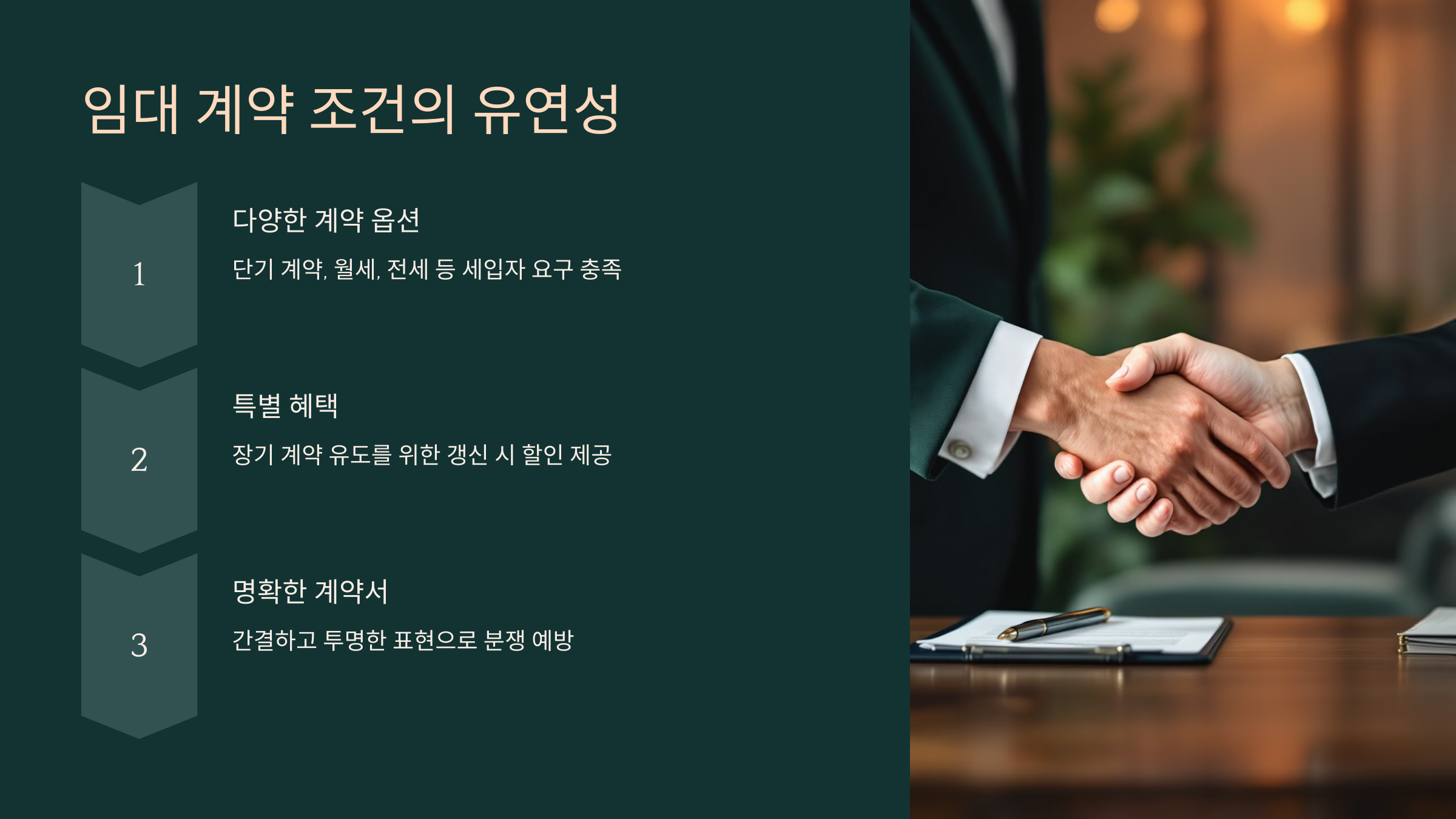 현대 사회에서는 임대 계약 조건의 유연성이 점점 더 중요해지고 있어요. 세입자들의 다양한 요구를 충족시키기 위해 단기 계약, 월세 및 전세 옵션 등을 제공하는 것이 필요해요.