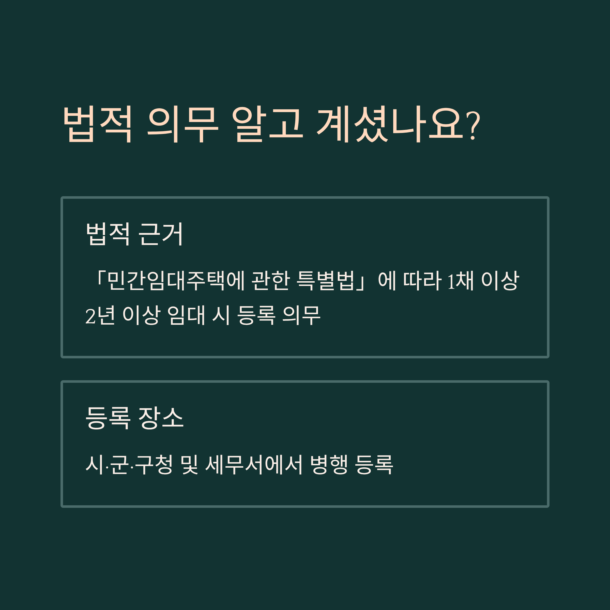 A1. 일정 기준 이상 임대 시 의무이며, 등록하면 세금·금융 혜택을 받을 수 있어요.