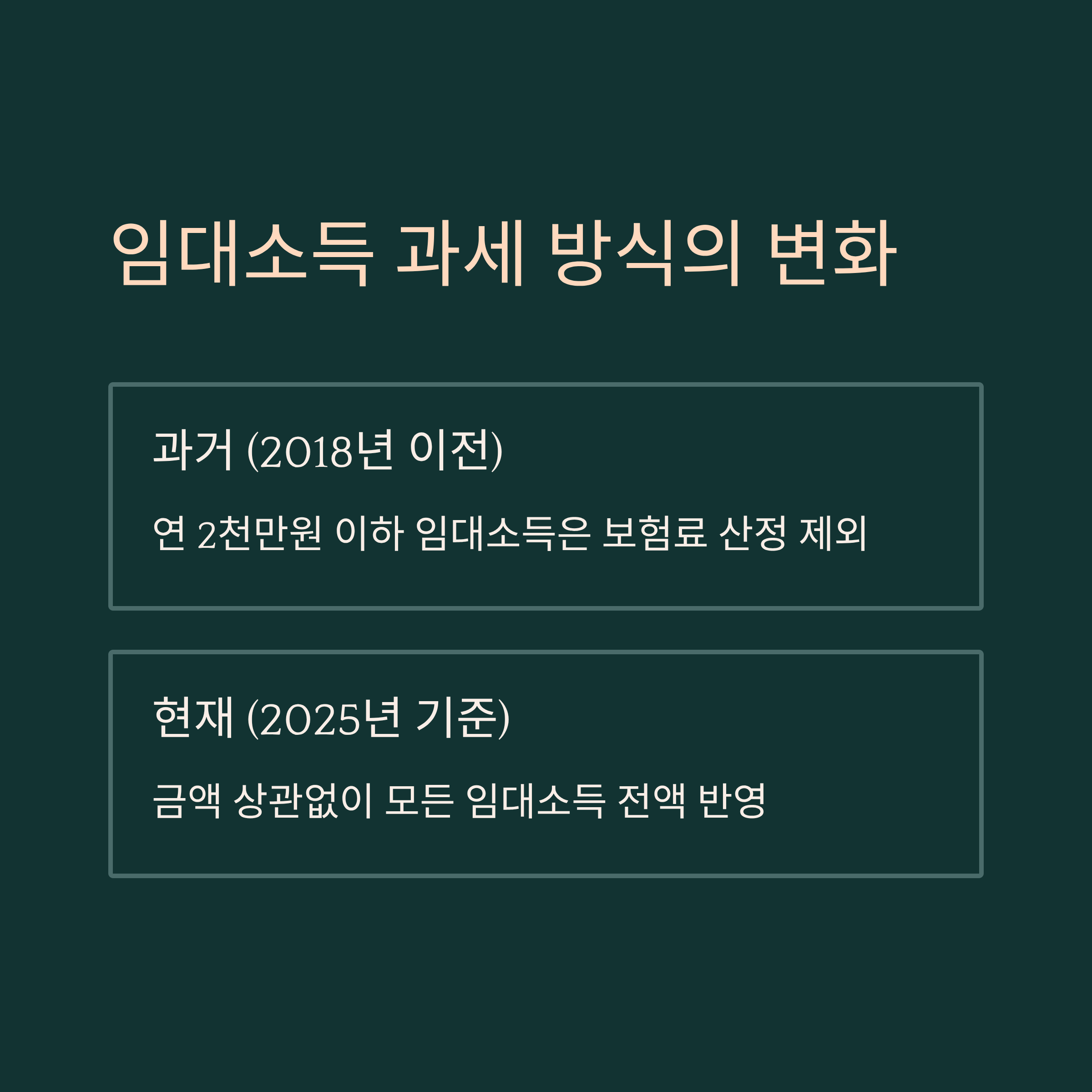 | 임대소득 2천만 원 이하 | 보험료 산정 제외 | 전액 반영 | 보험료 상승 폭 큼 |