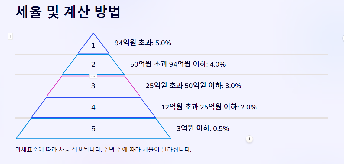 - 세율 적용: 과세표준에 해당하는 세율을 적용해 종합부동산세를 계산합니다.