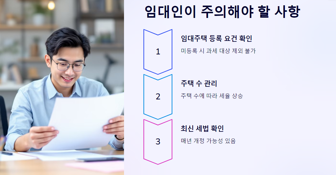 - 임대주택 등록 요건 확인: 임대주택으로 등록하지 않은 경우 과세 대상에서 제외될 수 없기 때문에 철저히 등록 요건을 준수해야 합니다.