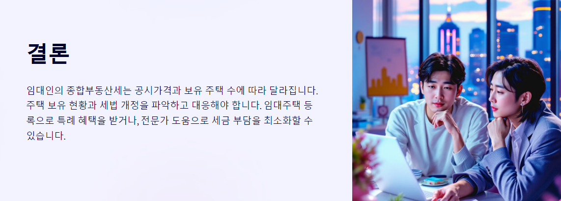 임대인에게 부과되는 종합부동산세는 공시가격과 보유 주택 수에 따라 달라집니다. 따라서 주택 보유 현황과 세법 개정을 철저히 파악하고 대응하는 것이 중요합니다. 임대주택 등록을 통해 특례 혜택을 받거나, 전문가의 도움을 받아 세금 부담을 최소화할 수 있습니다.