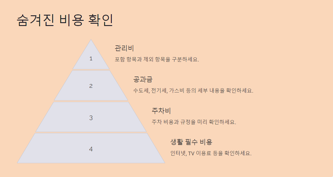 계약 시 추가로 발생할 수 있는 비용(예: 관리비, 공과금)을 꼼꼼히 체크해야 합니다.