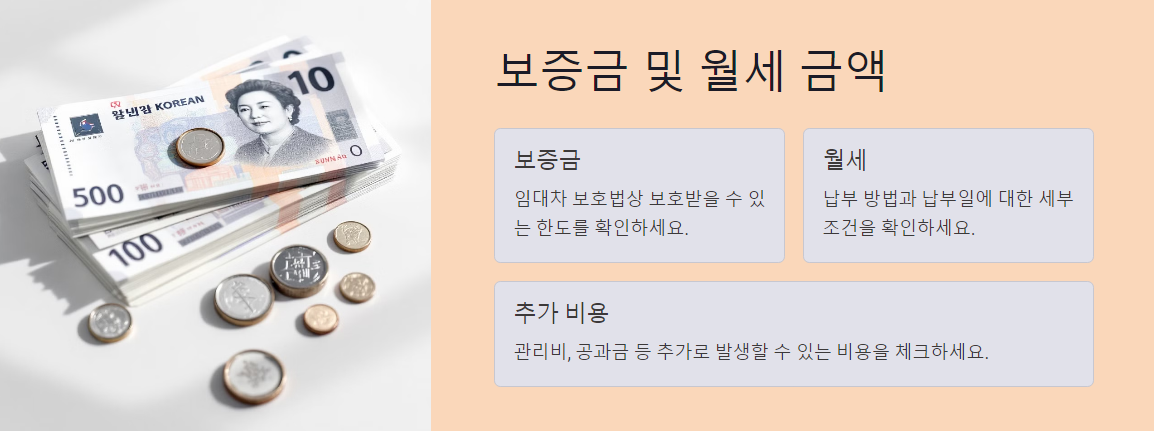 임대 계약 시 가장 중요한 부분 중 하나는 보증금과 월세 금액입니다. 해당 금액이 자신의 예산에 적합한지 확인하세요.