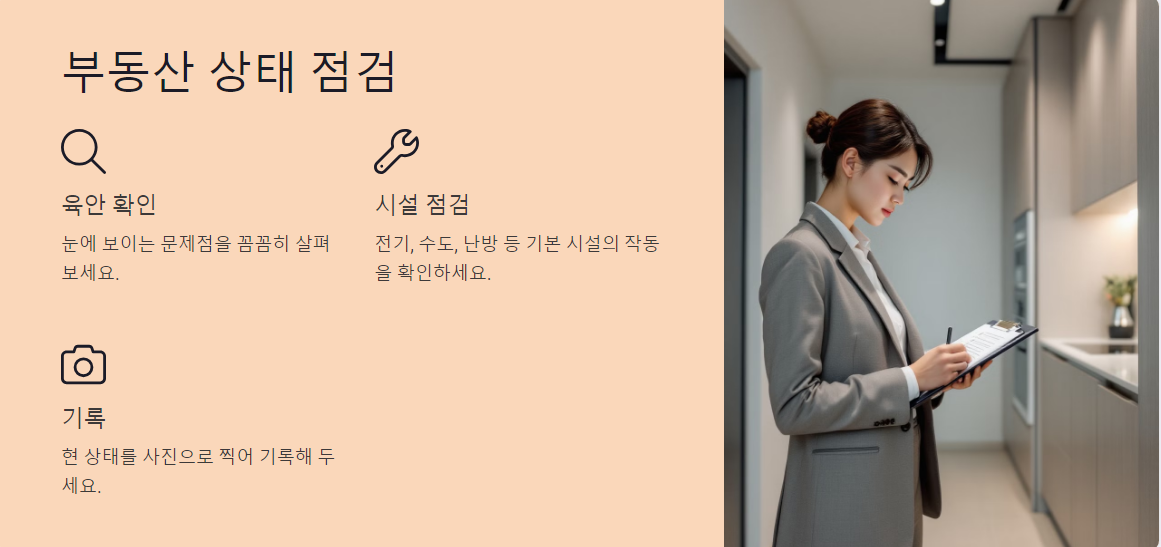 부동산 내부의 청결 상태와 도배, 바닥 상태도 중요합니다. 사진을 찍어 기록해 두세요.