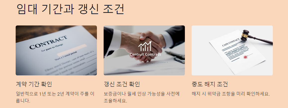 임대 기간 중 중도 해지 조건도 중요한 요소입니다. 해지 시 위약금 조항을 미리 확인하세요.