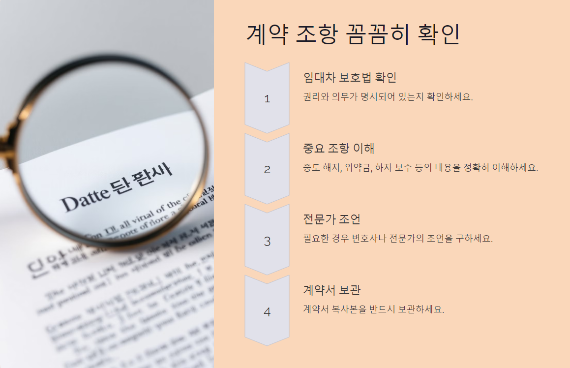 계약서의 모든 조항은 꼼꼼히 읽어보아야 합니다. 특히, 임대차 보호법에 따른 권리와 의무가 명시되어 있는지 확인하세요.