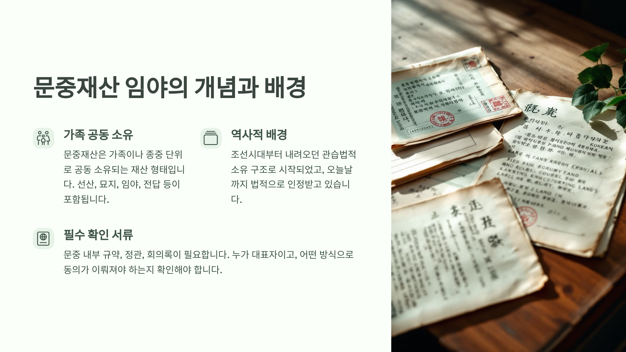 "문중재산"은 특정 성씨나 집단이 대대로 공동 소유해온 전통적인 재산으로, 단순한 사유지 이상의 의미를 갖는 경우가 많아요. 그래서 계약할 때는 단순히 소유자 서명만으로는 부족하고, 문중 구성원의 동의나 회의록 등이 필수일 수 있어요.