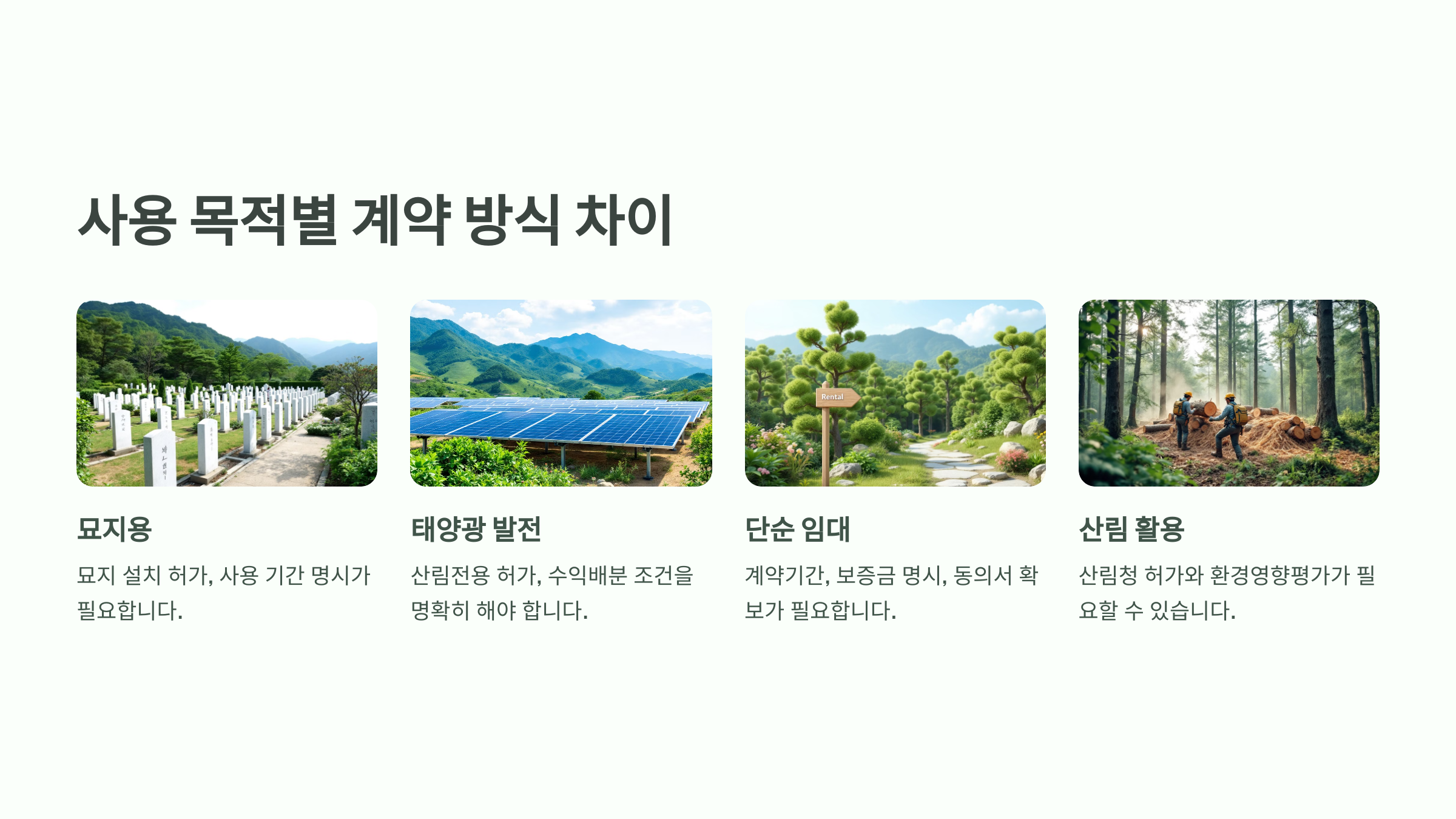 임야는 어떤 목적에 따라 계약 방식이 크게 달라져요. 단순 임대인지, 개발 목적 매입인지, 묘지 설치인지에 따라 문중의 동의 조건도 달라지고 행정 절차도 달라지거든요.