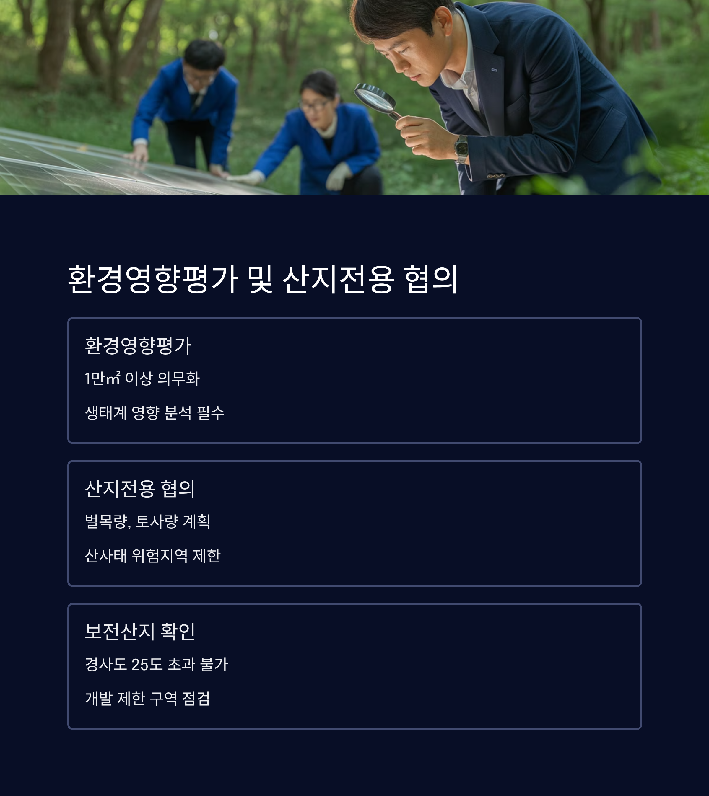 임야에 태양광 발전소를 설치할 경우, 산림 훼손이나 토양 유실 등의 환경 문제가 함께 따라오기 때문에 환경영향평가는 반드시 체크해야 할 항목이에요. 특히 개발면적이 1만㎡ 이상일 경우에는 소규모 환경영향평가가 의무화돼요.