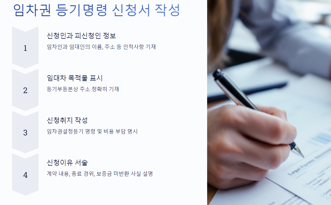 - 예시: “본인의 주택임차권설정등기를 명하고, 그 비용은 피신청인의 부담으로 할 것을 구합니다.”