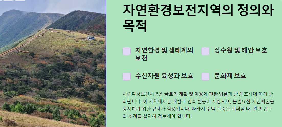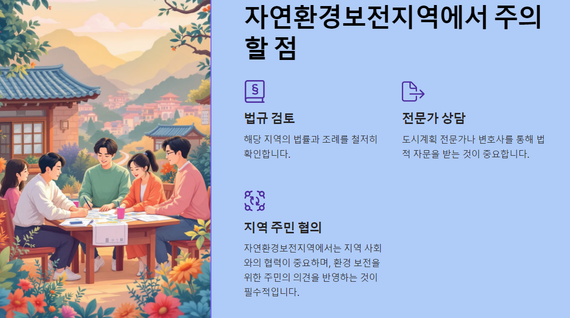 - 지역 주민 협의: 자연환경보전지역에서는 지역 사회와의 협력이 중요하며, 환경 보전을 위한 주민의 의견을 반영하는 것이 필수적입니다.