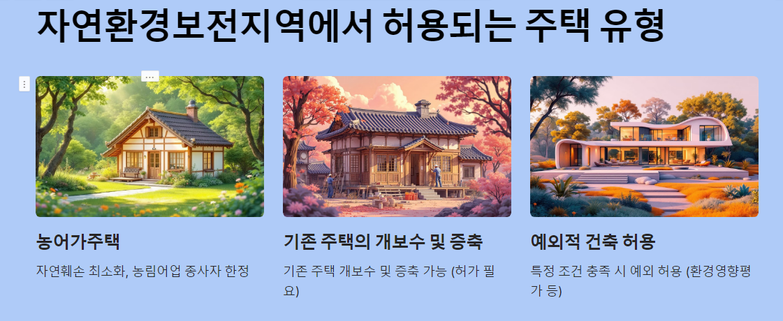 이미 존재하는 주택은 일정 조건 하에 개보수나 증축이 가능합니다. 단, 추가 건축 면적이나 용도 변경은 관할 지자체의 허가가 필요하며, 이 역시 생태계에 미치는 영향을 최소화해야 합니다.