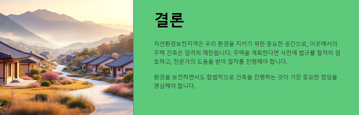 자연환경보전지역은 우리 환경을 지키기 위한 중요한 공간으로, 이곳에서의 주택 건축은 엄격히 제한됩니다. 주택을 계획한다면 사전에 법규를 철저히 검토하고, 전문가의 도움을 받아 절차를 진행해야 합니다. 환경을 보전하면서도 합법적으로 건축을 진행하는 것이 가장 중요한 점임을 명심해야 합니다.