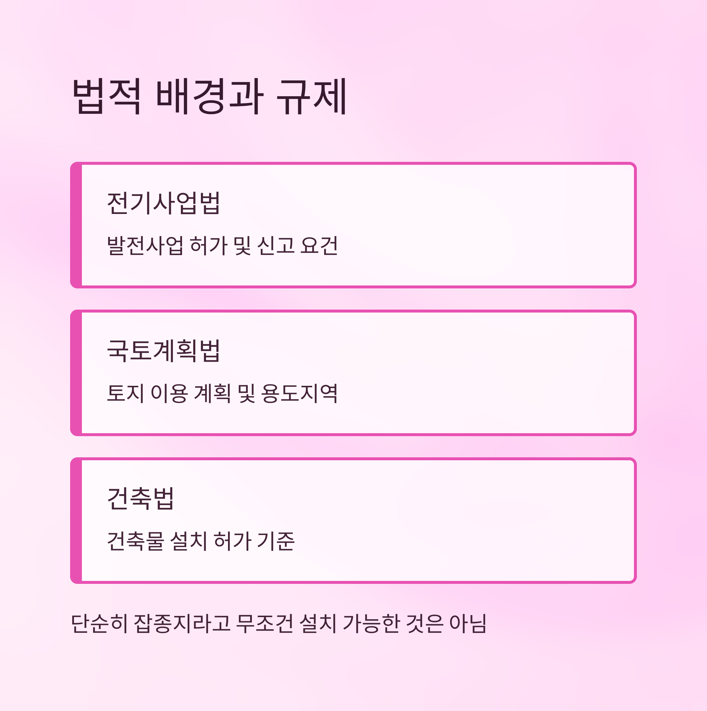 하지만 아무리 잡종지라 해도, 지목이 '잡종지'라는 이유 하나만으로 무조건 태양광 발전소 설치가 가능한 건 아니에요. 전기사업법, 국토계획법, 건축법 등 다양한 법률이 얽혀 있어요. 오늘은 바로 이 내용을 자세히 풀어볼게요! ⚡️